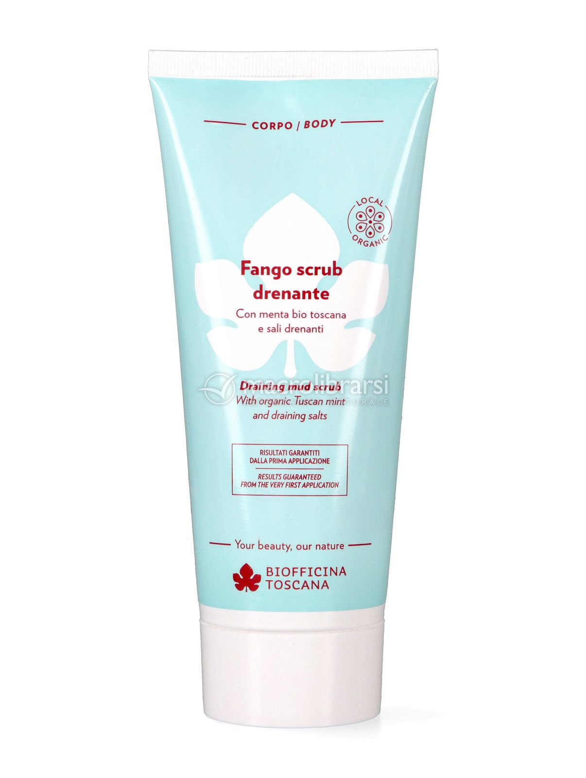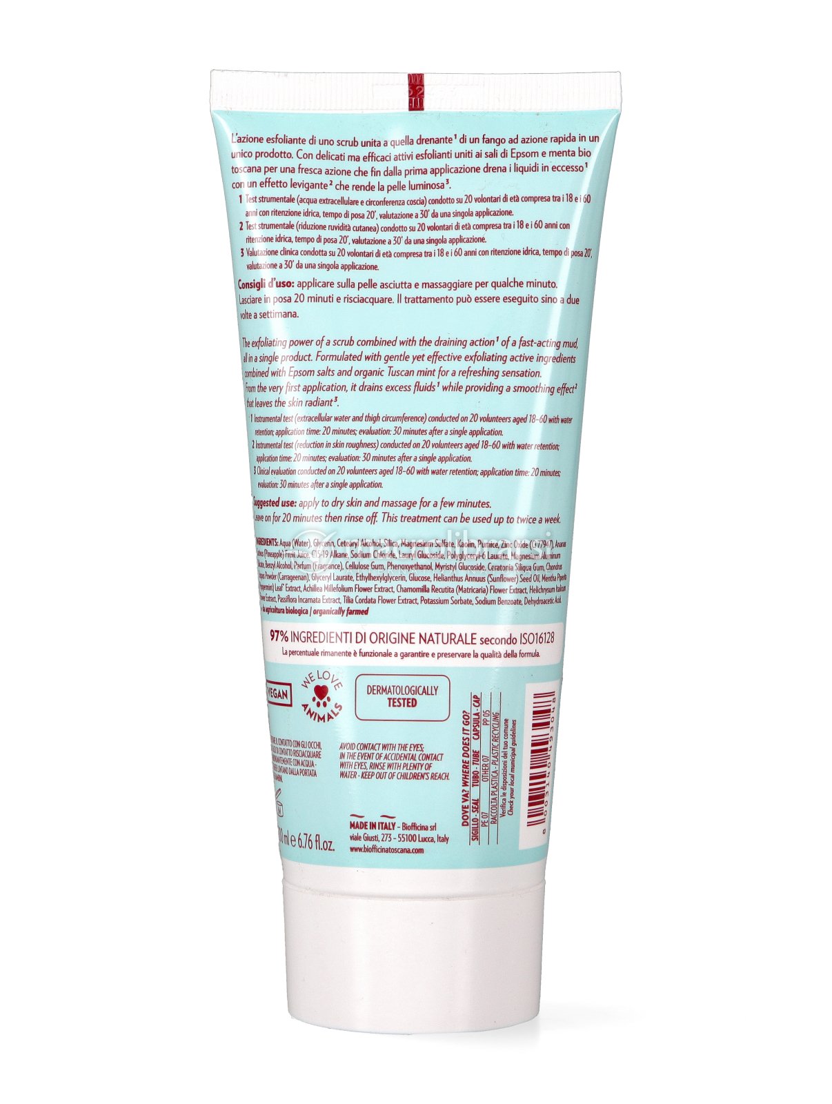Fango Scrub Drenante di Biofficina Toscana contiene polvere di pomice e quarzo, delicati ma efficaci attivi esfolianti, uniti ai Sali di Epsom, mirati estratti antiossidanti-lenitivi, succo di ananas ad azione drenante e menta bio toscana per una fresca azione che in soli 20 minuti fin dalla prima applicazione drena i liquidi in eccesso* con un effetto levigante che rende la pelle luminosa.
