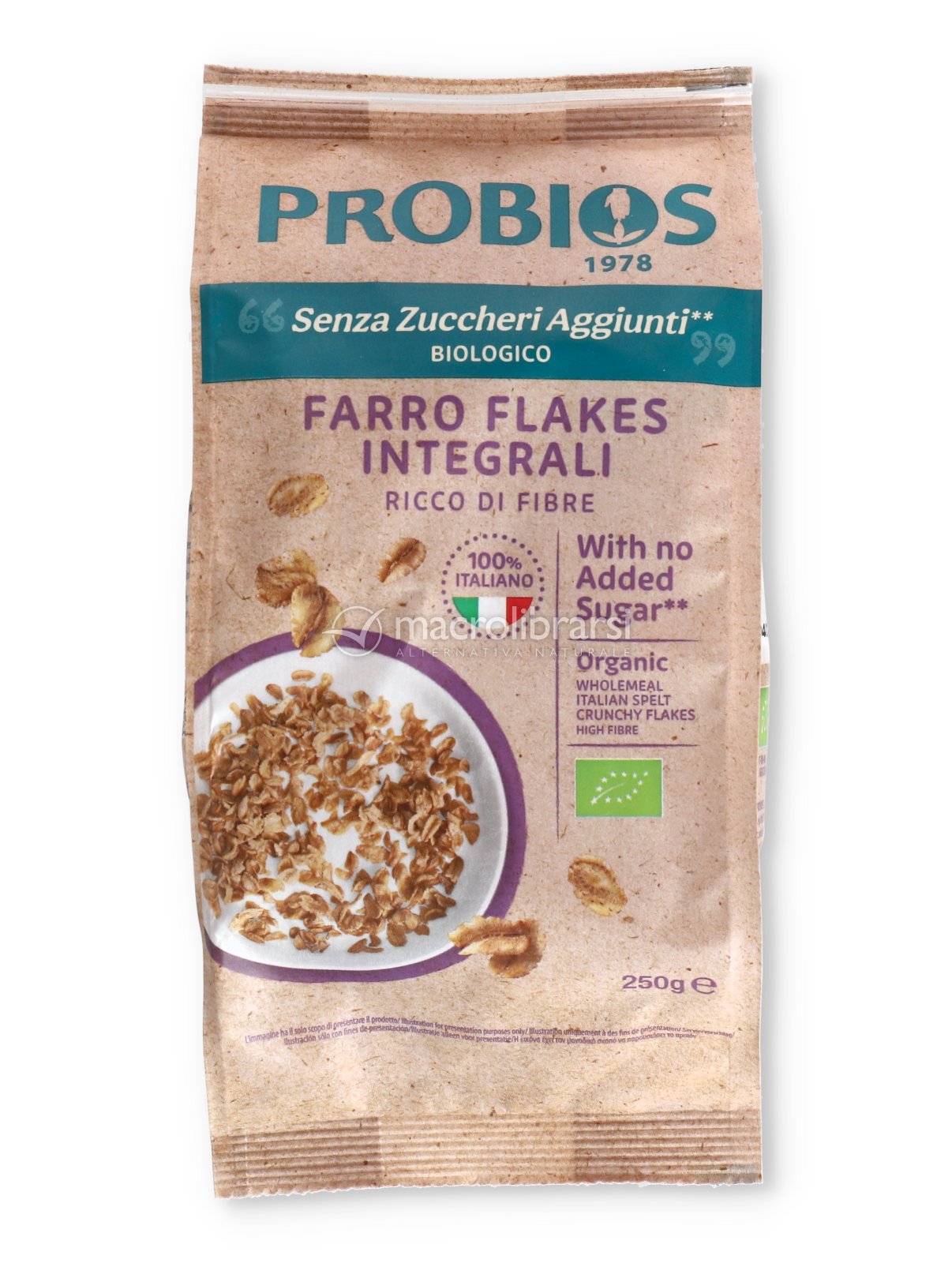 I Farro Flakes integrali di Probios sono prodotti in Italia, senza zuccheri aggiunti e provengono da agricoltura biologica certificata.