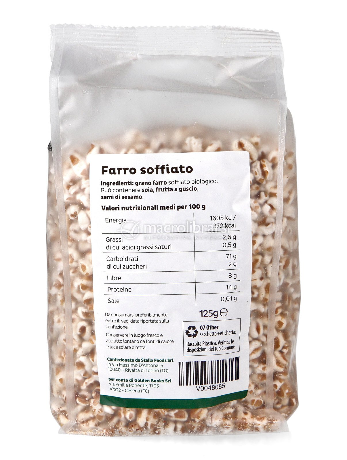 Farro soffiato per la prima colazione e di prima scelta, biologico e proposto dalla stessa ditta Macrolibrarsi. Lo si può aggiungere indifferentemente sia nello yogurt che nel latte vegetale o vaccino, una volta cotto. Aiuta nel tempo l'intero intestino con le sue fibre a smaltire le sostanze tossiche.