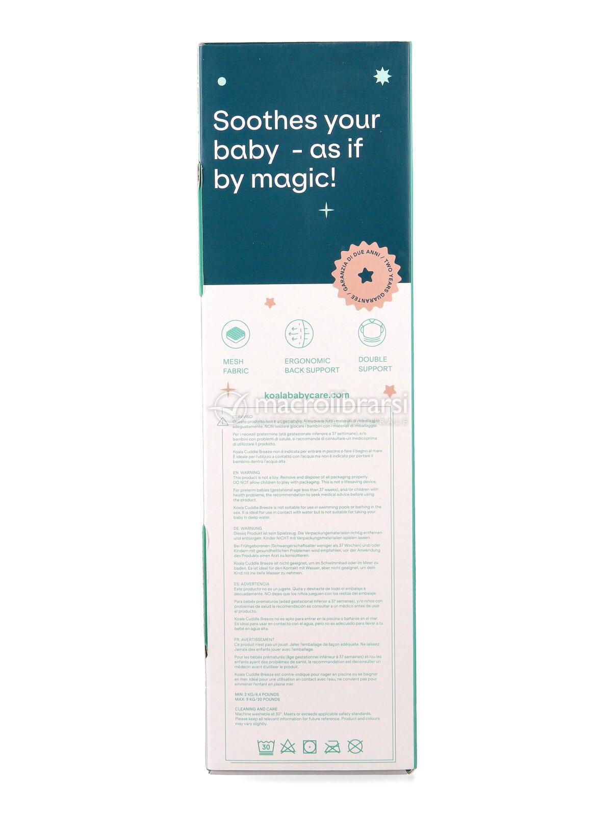 | Avvertenze | Questo prodotto non è un giocattolo. Rimuovere tutti i materiali di imballaggio adeguatamente. Non lasciare giocare i bambini con i materiali di imballaggio. Per i neonati pretermine (età gestazionale inferiore a 36 settimane) e/o bambini con problemi di salute, si raccomanda di consultare un medico prima di utilizzare il prodotto. Koala Cuddle Breeze non è indicata per entrare in piscina o fare il bagno al mare. È ideale per l'utilizzo a contatto con l'acqua ma non è indicata per portare il bambino dentro l'acqua alta. |