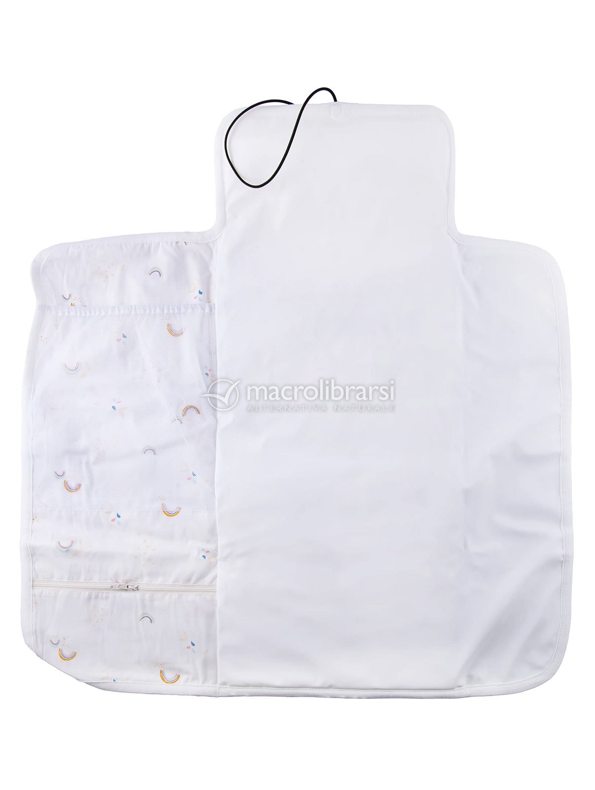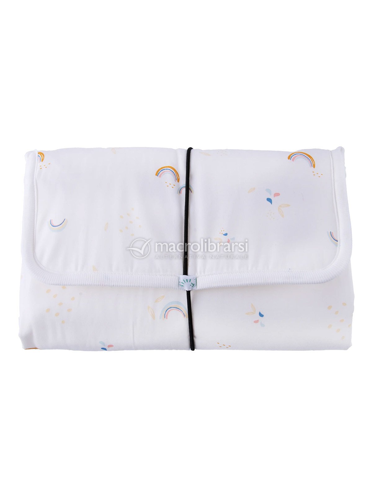 Fasciatoio da viaggio con lato in cotone biologico certificato e imbottitura morbida e assorbente, per poter cambiare il bambino ovunque, appoggiandolo su una superficie confortevole e pulita.