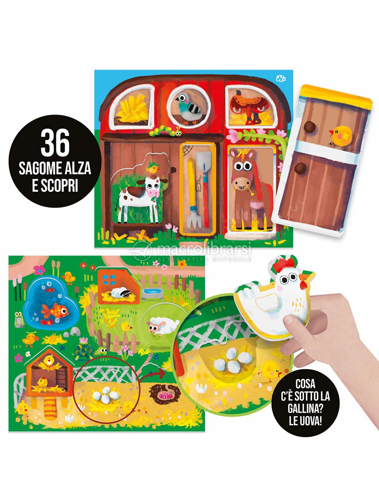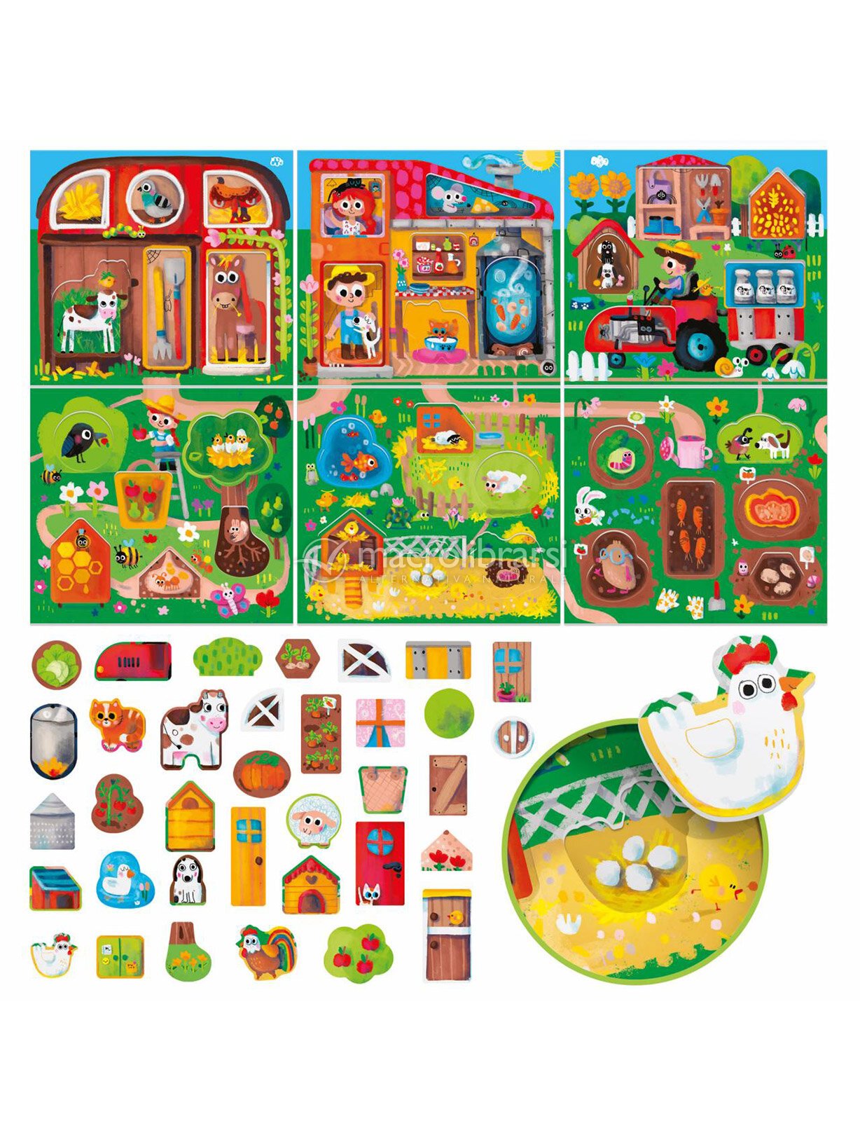 Chi dorme nella stalla? Cosa nasce nell’orto e dove si conserva il grano? Divertiti a fare tante scoperte nella fattoria in compagnia degli animali e dei suoi abitanti!