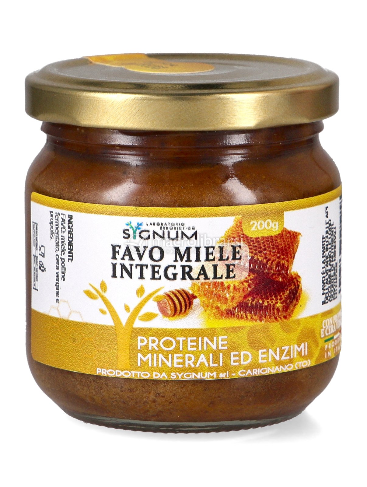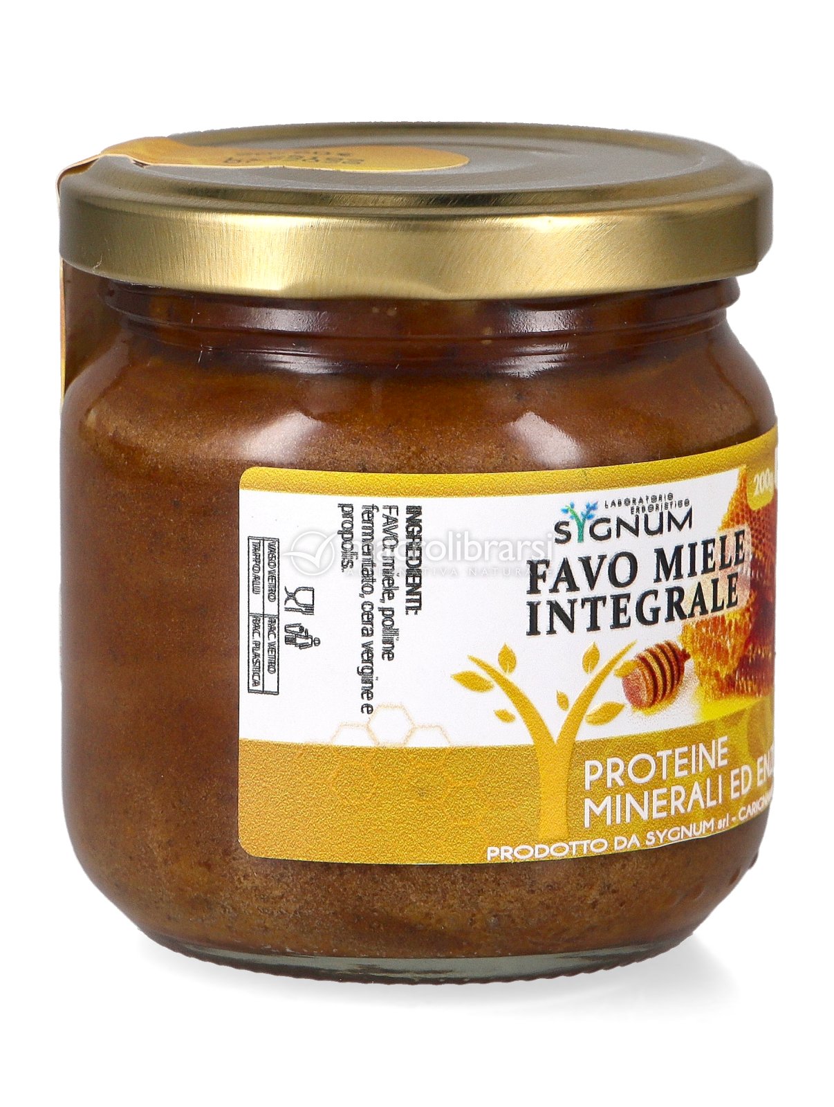 Favo miele integrale, con propoli, cera vergine e polline fermentato ad azione remineralizzante e ricostituente.