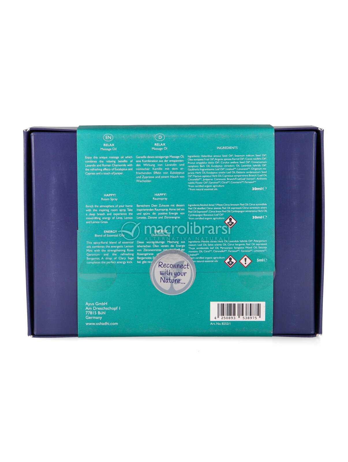 Questo set contiene tre prodotti differenti ed utili per diverse esigenze. L'olio essenziale nella bottiglia da 10 ml, ha effetto stimolante con agrumi, e menta, lo utilizzo sia unito al mio olio, sia dentro umidificatore. Poi l'olio massaggio è rilassante con profumo sempre fruttato. Mentre lo spray ambiente rinfresca l'aria grazie alle note balsamiche. Acquistato per conoscere la casa produttrice. Devo dire che è un bel mix che può essere utilizzato in diverse occasioni.