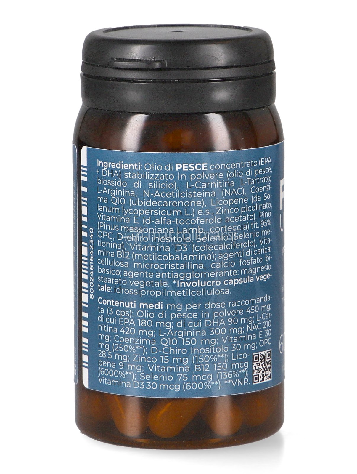 La formula è arricchita con olio di pesce (EPA e DHA), L-carnitina, L-arginina e N-acetilcisteina (NAC), insieme a coenzima Q10 e licopene, per sostenere il metabolismo energetico e contrastare lo stress ossidativo.