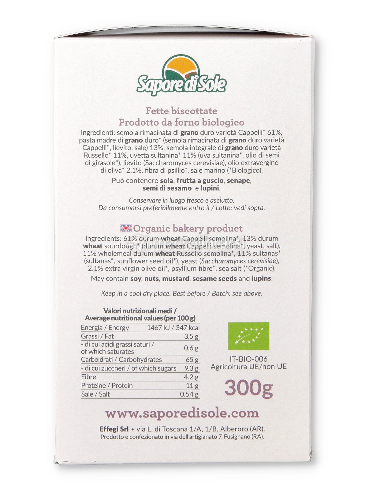 Le FettaMadre di Sapore di Sole hanno tutto il sapore e la croccantezza di un prodotto genuino e biologico, addolcito con deliziosa uvetta sultanina e realizzato artigianalmente con materie prime selezionate, a partire da pasta madre di grano duro varietà Cappelli.
