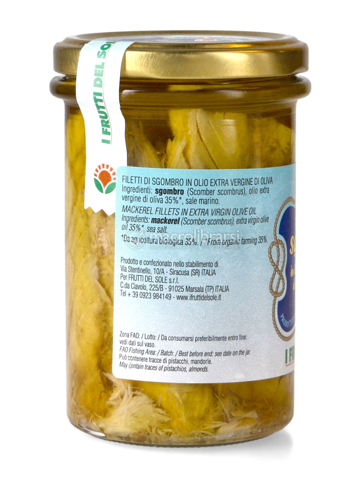 I Filetti di Sgombro di I Frutto del Sole sono conservati in olio extra vergine di oliva biologico.