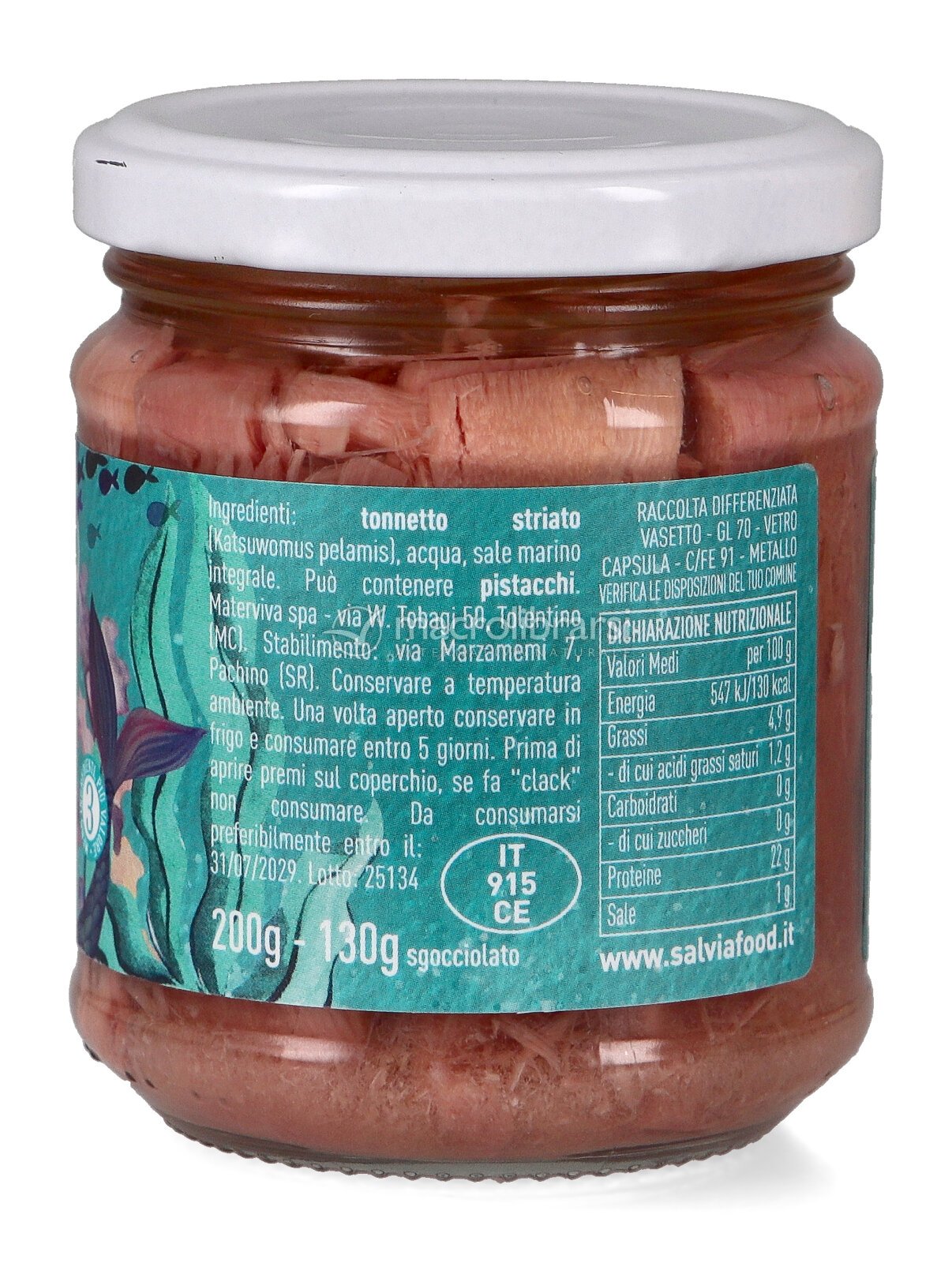 Il Tonno Striato utilizzato viene pescato in mari italiani e lavorato da aziende di piccole dimensioni rispettose dell'ambiente e della tradizione. Infatti, per offrire un alimento di elevata qualità, Salvia garantisce metodi di pesca sostenibili e trasformazioni semplici. Non solo, ogni fase produttiva viene controllata con analisi in modo da assicurare un livello di sostanze indesiderate (ad esempio, i metalli pesanti) ampiamente al disotto dei limiti normativi di salubrità.