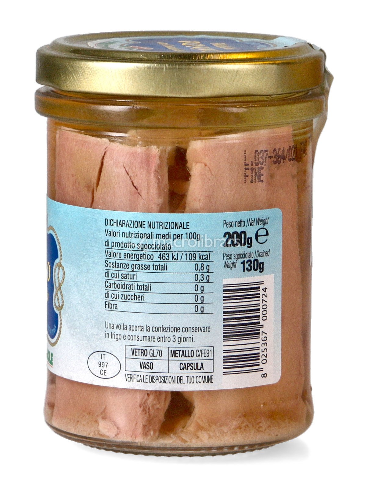 Questa conserva è realizzata con tonno conservato al naturale solo con acqua e sale, per lasciare inalterato tutto il sapore del pesce.