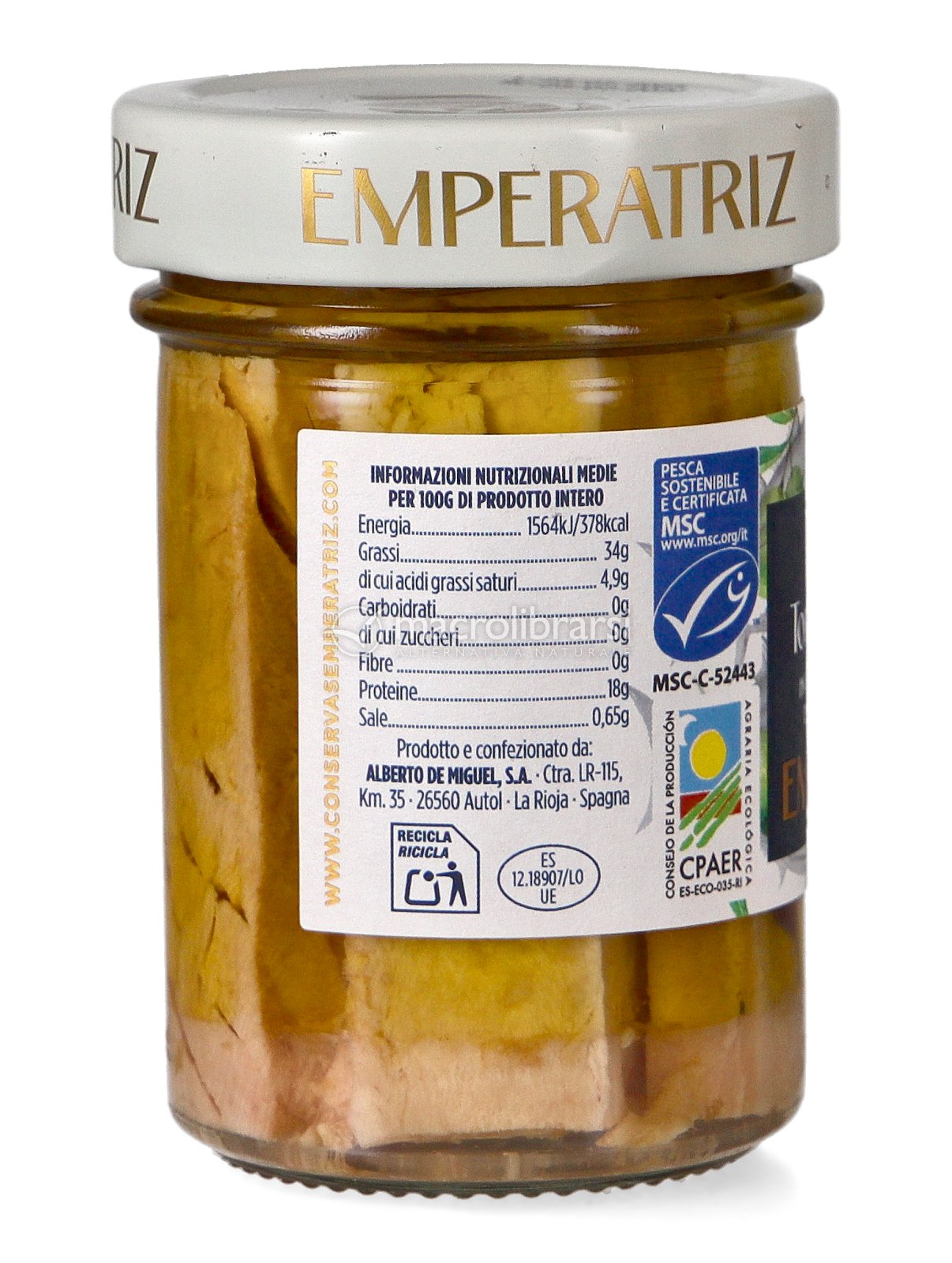 I Filetti di Tonno Alalunga MSC in Olio Extra Vergine di Oliva Biologico – Conservas Emperatriz rappresentano l’eccellenza della pesca sostenibile unita a una lavorazione artigianale di alta qualità.