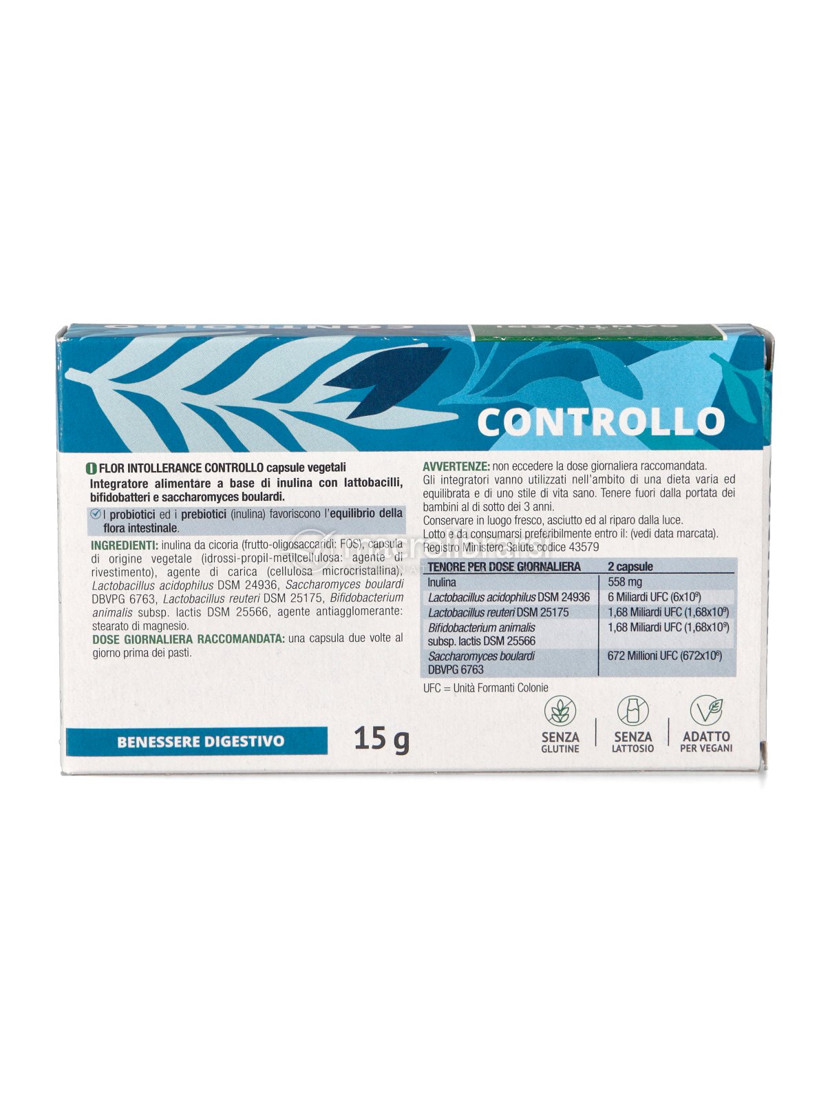 Integratore con prebiotici e probiotici utile in caso di intolleranze alimentari.