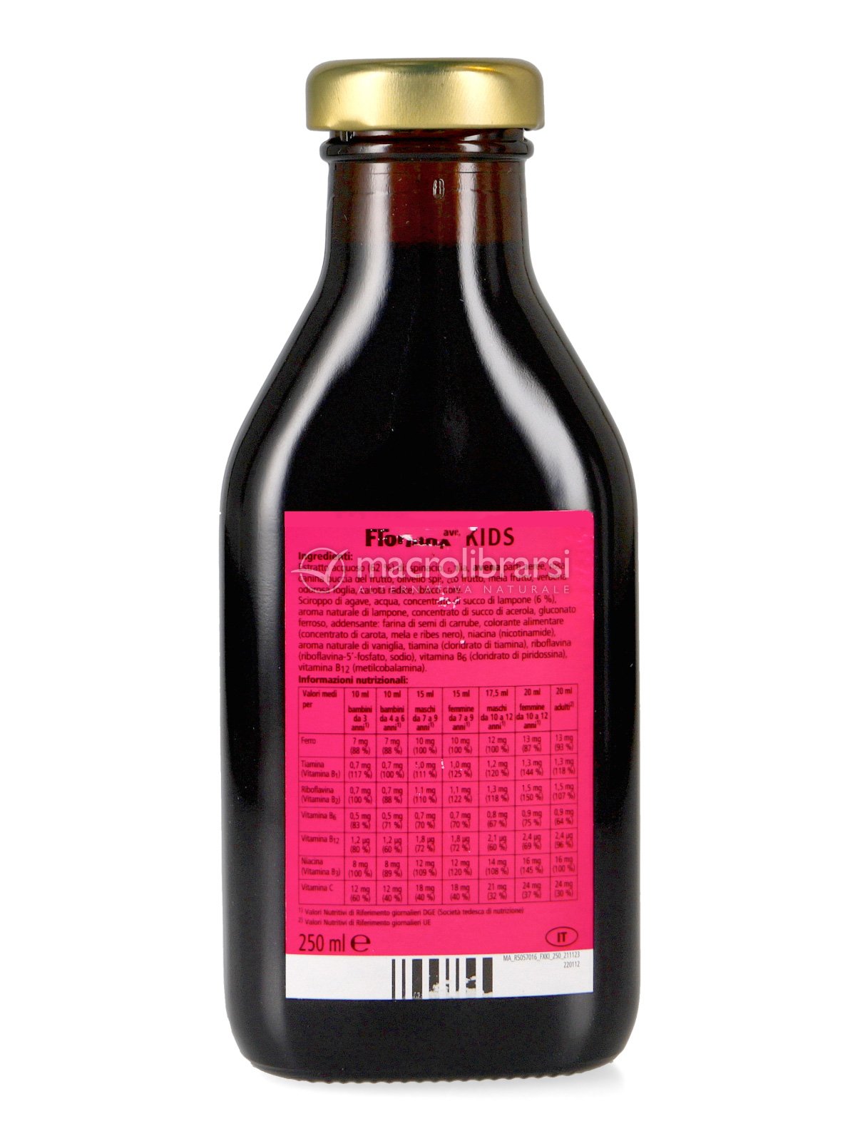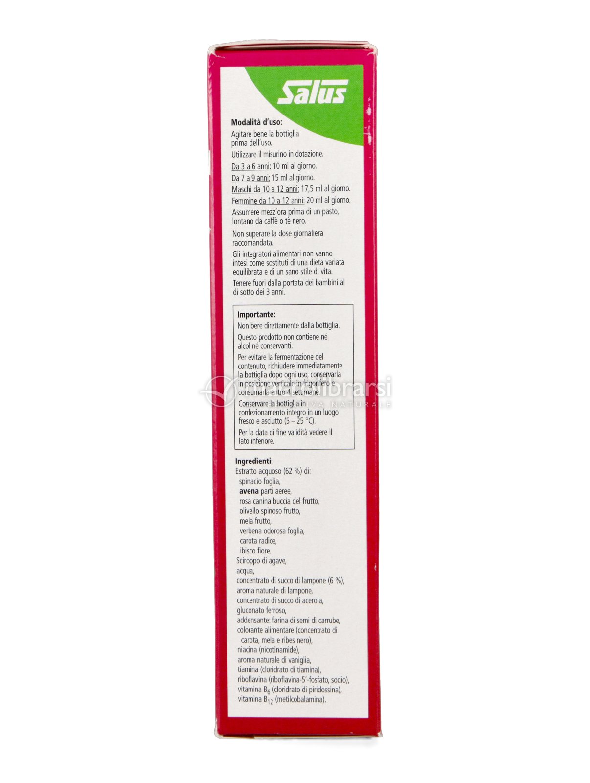 Estratto acquoso (62 %) di: spinacio foglia, avena parti aeree, rosa canina buccia del frutto, olivello spinoso frutto, mela frutto, verbena odorosa foglia, carota radice, ibisco fiore. Sciroppo di agave, acqua, concentrato di succo di lampone (6 %), aroma naturale di lampone, concentrato di succo di acerola, gluconato ferroso, addensante: farina di semi di carrube, colorante alimentare (concentrato di carota, mela e ribes nero), niacina (nicotinamide), aroma naturale di vaniglia, tiamina (cloridrato di tiamina), riboflavina (ribofl avina-5’-fosfato, sodio), vitamina B6 (cloridrato di piridossina), vitamina B12 (metilcobalamina).