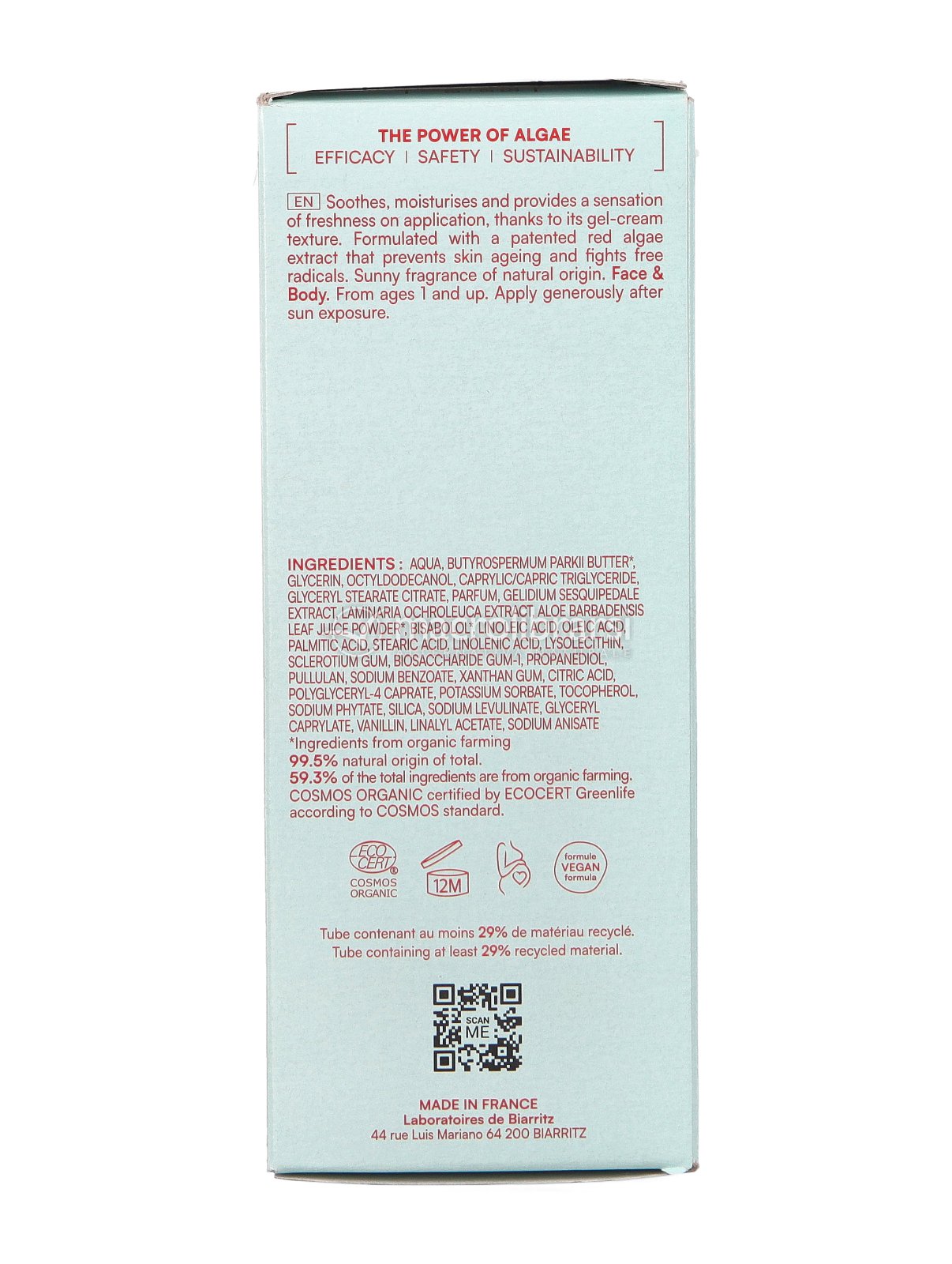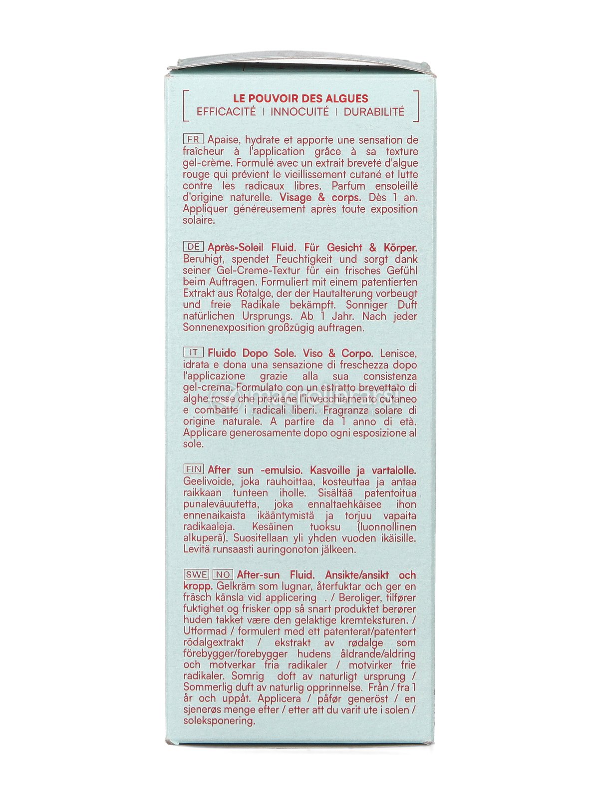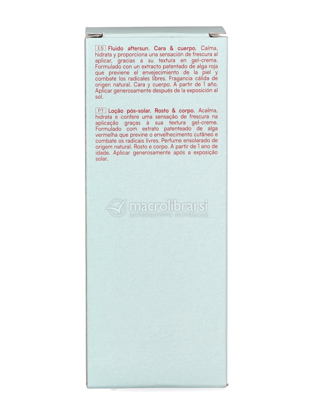 La sua formula contiene un estratto brevettato di alghe rosse dal forte potere antiossidante capace di proteggere viso e corpo dagli attacchi dei radicali liberi anche dopo l'esposizione, facendo scomparire le sensazioni di bruciore e calore e regalando all'epidermide comfort e morbidezza.