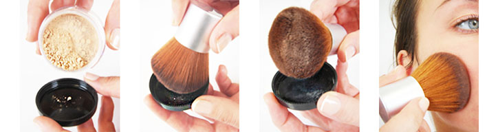 Lascia cadere una piccola quantità di polvere minerale nel coperchio della confezione. Ruota il pennello (kabuki o flatbuki) nel prodotto finché le setole non hanno assorbito tutta la polvere. Applica il prodotto sul viso con movimenti circolari, insistendo sulle zone che necessitano maggiore coprenza.