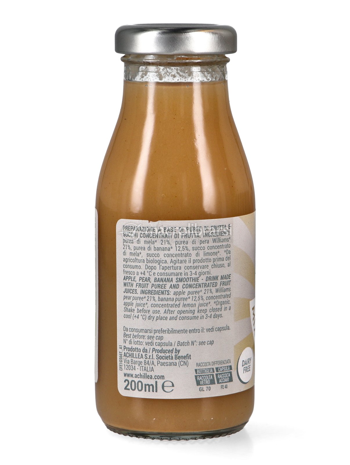 L’incontro tra mele e pere di origine italiana e banane mature e profumate dà vita a un frullato dalla consistenza vellutata, ideale per la merenda o per una pausa pratica e piacevole.