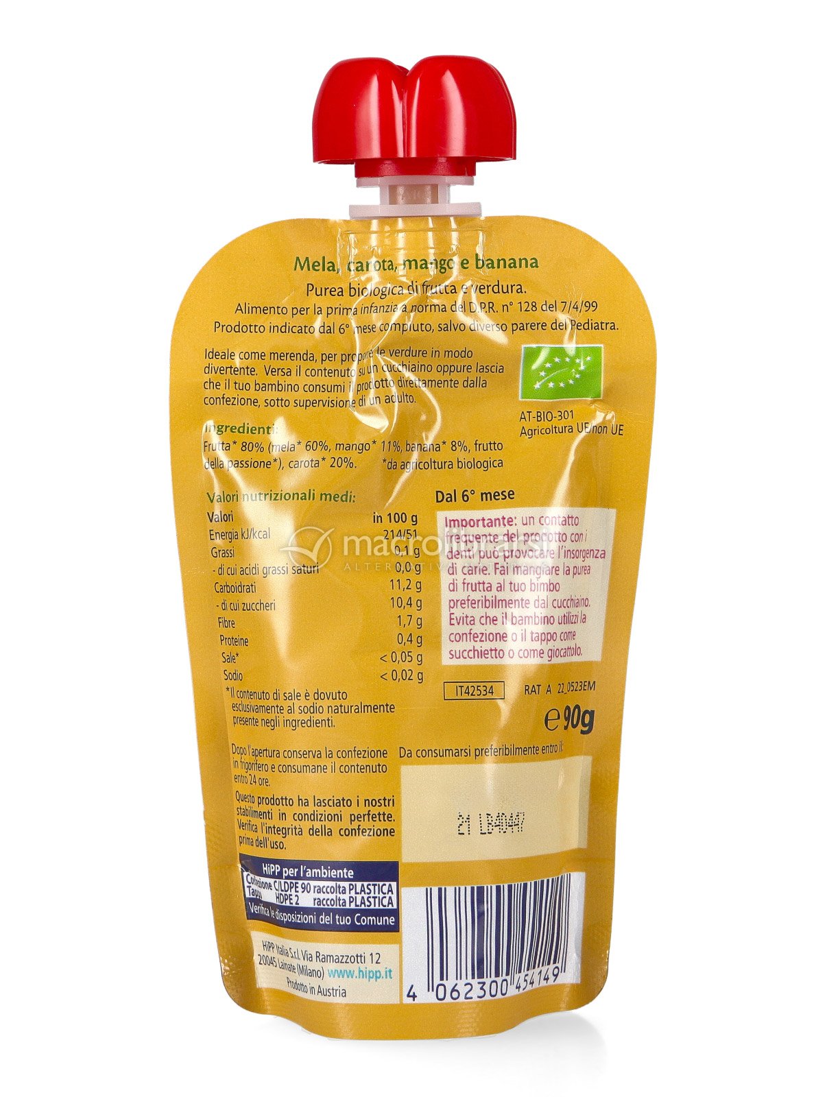 Purea di mele, carota, mango e banana in pratica confezione da spremere, ideale per uno spuntino sfizioso e genuino a partire dai 6 mesi.