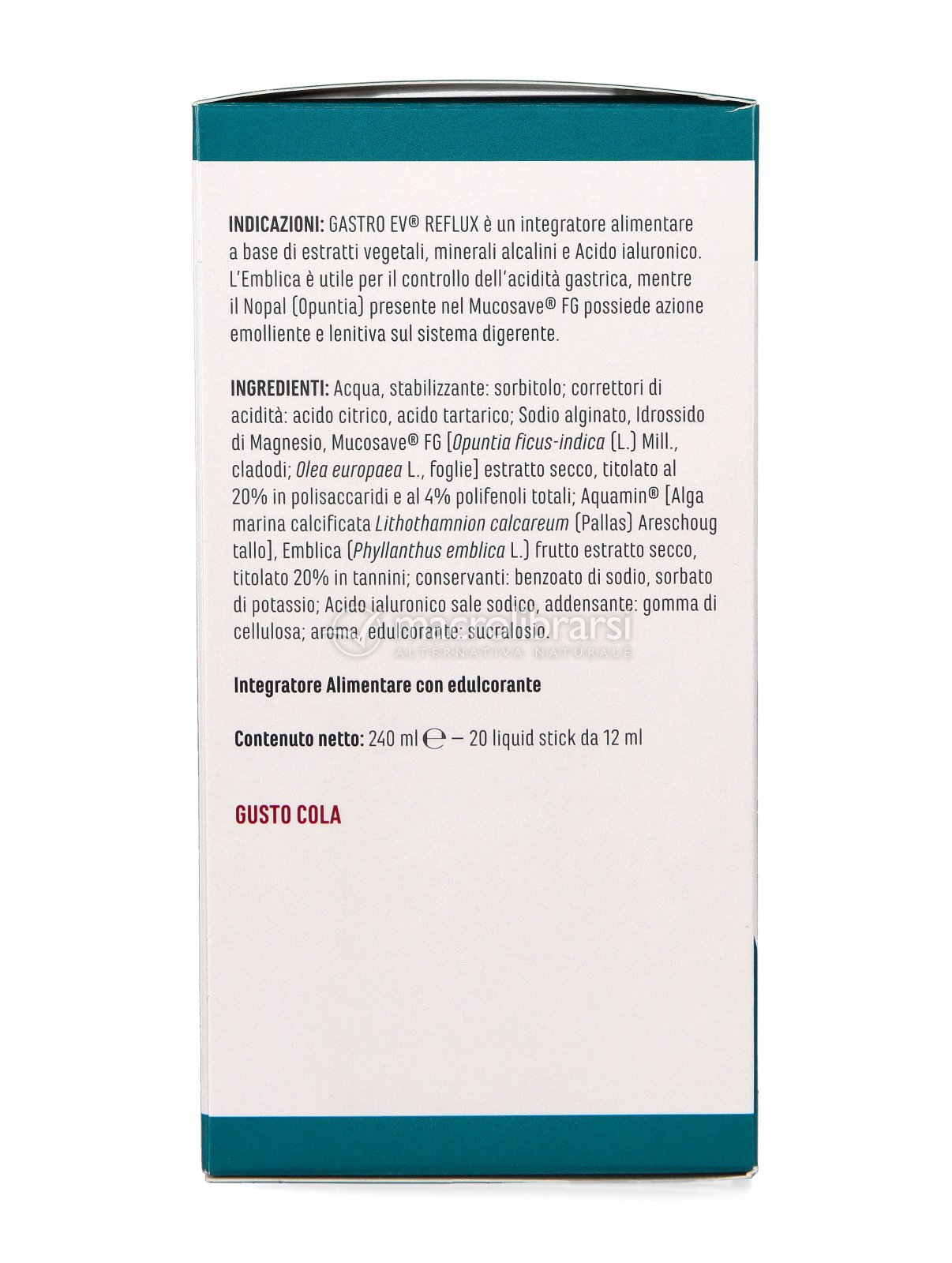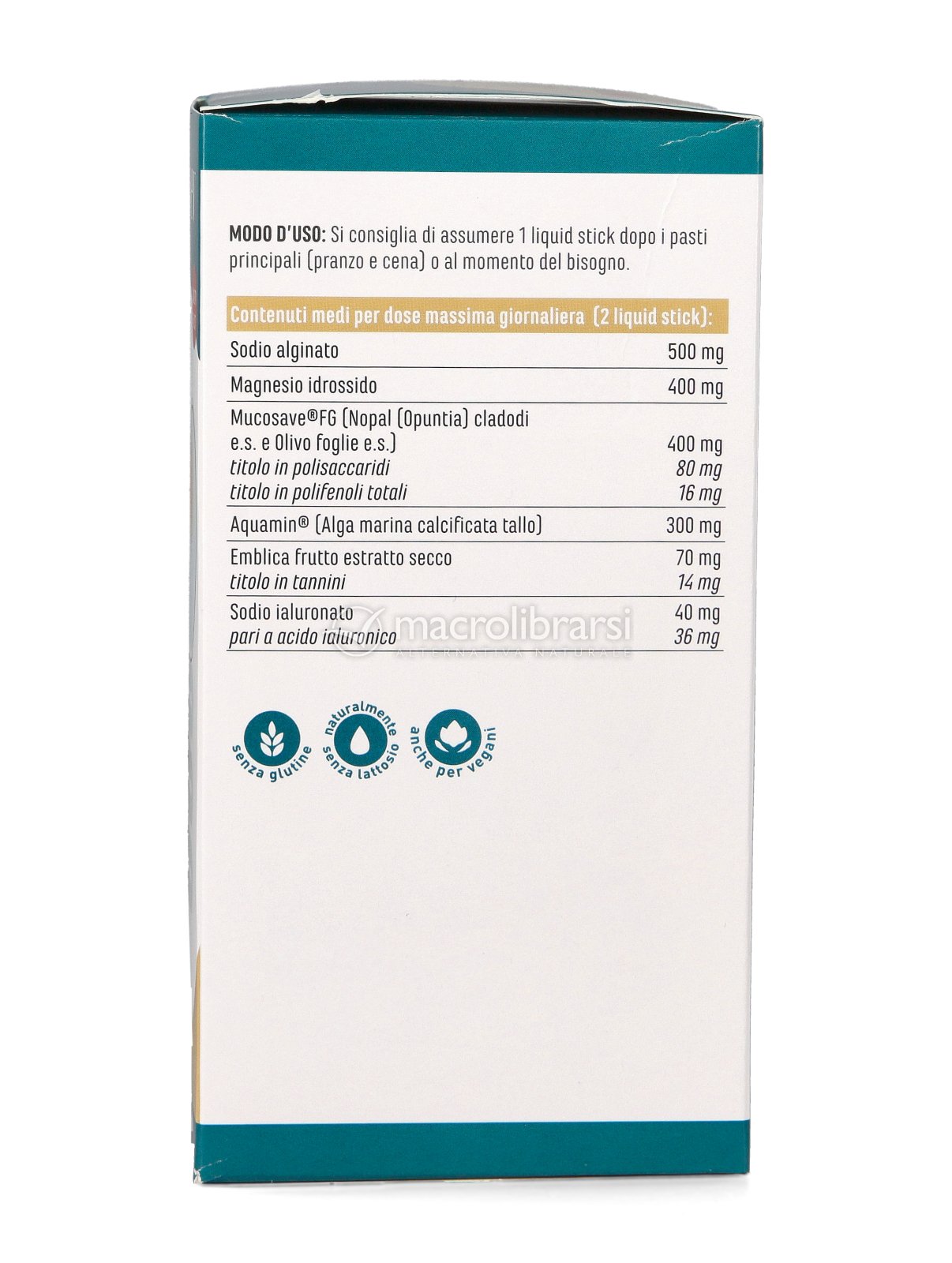 Acqua, stabilizzante: sorbitolo; correttori di acidità: acido citrico, acido tartarico; Sodio alginato, Idrossido di Magnesio, Mucosave® FG [Opuntia ficus-indica (L.) Mill., cladodi; Olea europaea L., foglie] estratto secco, titolato al 20% in polisaccaridi e al 4% polifenoli totali; Aquamin® [Alga marina calcificata Lithothamnion calcareum (Pallas) Areschoug tallo], Emblica (Phyllanthus emblica L.) frutto estratto secco, titolato 20% in tannini; conservanti: benzoato di sodio, sorbato di potassio; Acido ialuronico sale sodico, addensante: gomma di cellulosa; aroma, edulcorante: sucralosio.