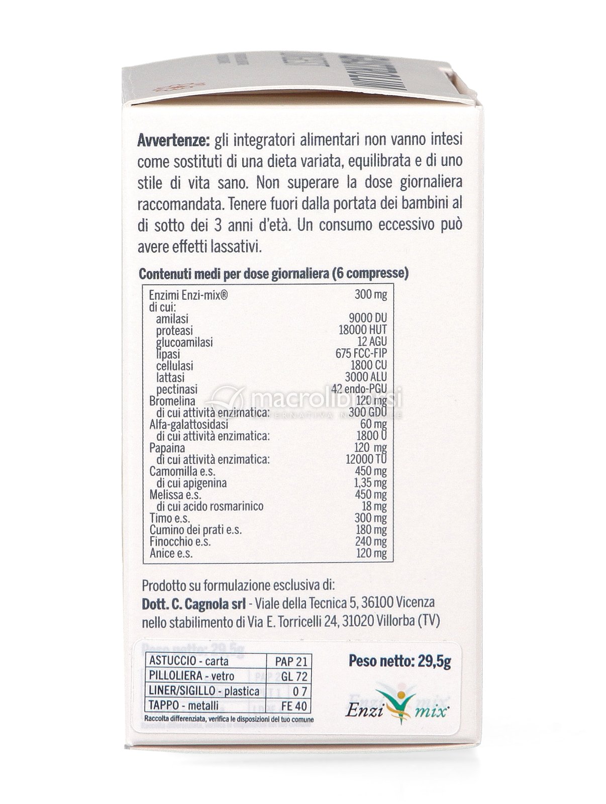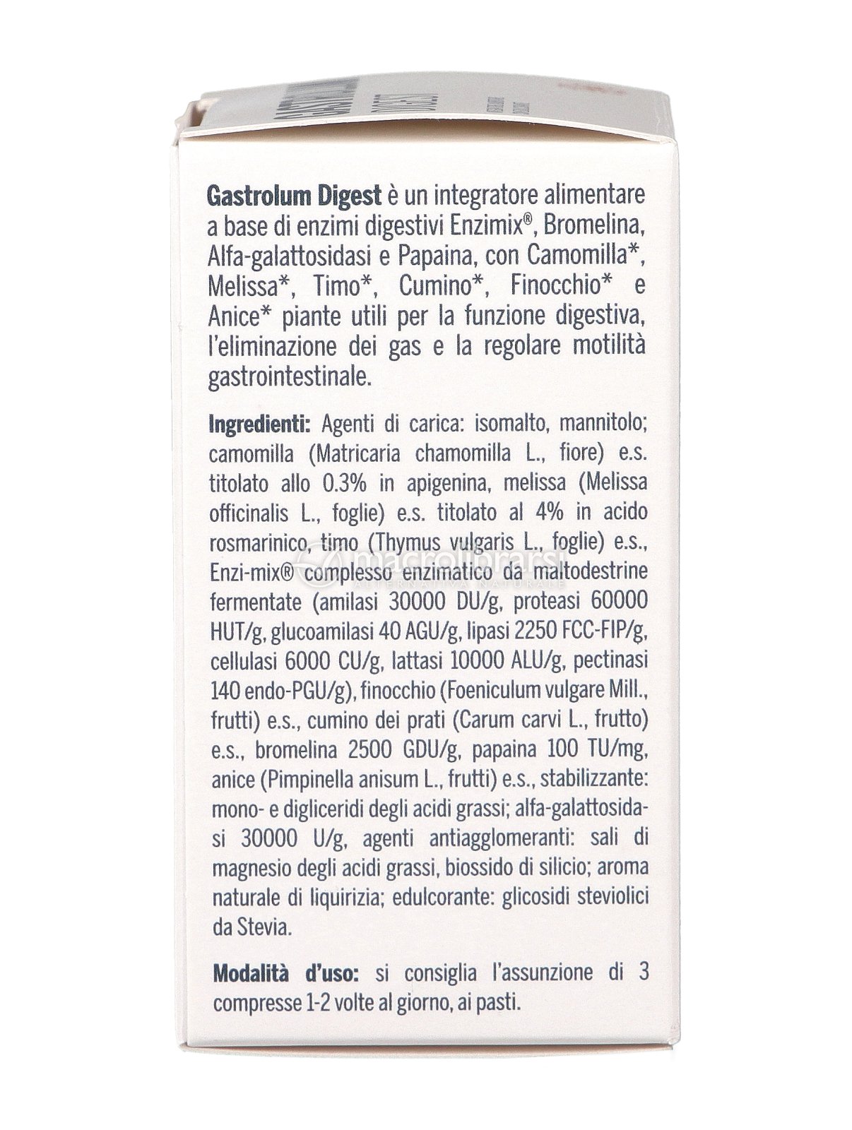 - Contiene enzimi digestivi Enzimix®, Bromelina, Alfa-galattosidasi e Papaina, fonti di enzimi digestivi utili per aiutare l'intestino a scomporre i principali macronutrienti (zuccheri, fibre, proteine, grassi);