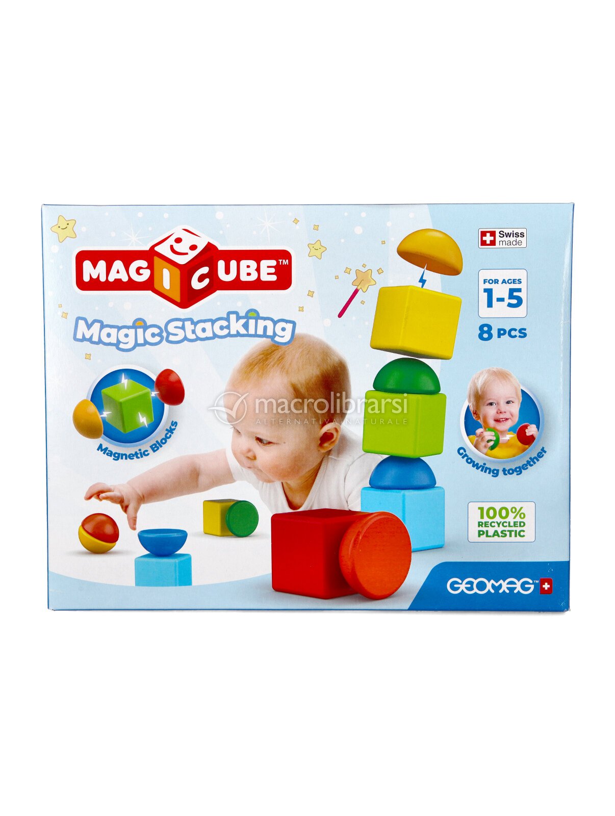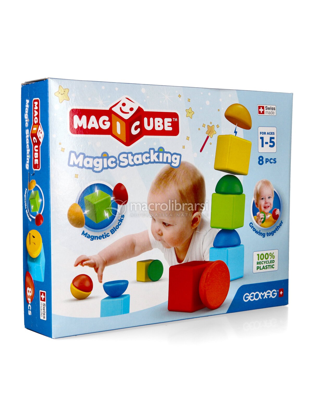 La confezione comprende 8 blocchi magnetici in plastica 100% riciclata.