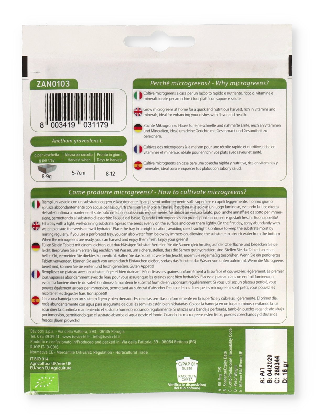 Varietà aromatica di aneto per microgreens, apprezzata per le sue foglie sottili e piumose e per il profumo fresco e delicato. Con il suo gusto caratteristico, è ideale per arricchire piatti di pesce, salse, insalate, verdure e sottaceti, donando un tocco aromatico raffinato a molte preparazioni.