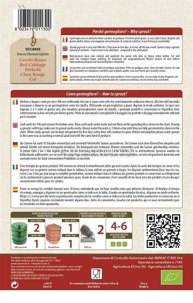 I semi di cavolo rosso biologico permettono di ottenere germogli dal gusto fresco e leggermente speziato, ricchissimi di nutrienti. In particolare contengono sostanze solforate in concentrazioni fino a 50 volte superiori rispetto al vegetale maturo, note per la loro azione chemio-protettrice a supporto della salute delle cellule.