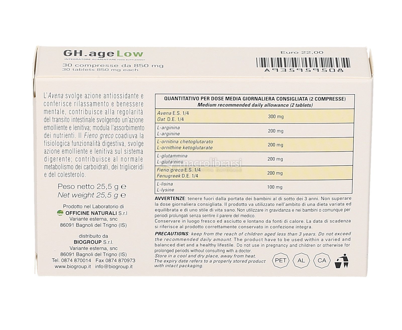 Disclaimer Non superare la dose giornaliera consigliata. Gli integratori alimentari non vanno intesi come sostituti di una dieta variata ed equilibrata. Tenere fuori dalla portata dei bambini al di sotto dei tre anni. Non utilizzare in gravidanza e nei bambini o comunque per periodi prolungati senza sentire il parere del medico. Conservare in luogo asciutto e lontano da fonti di calore. Richiudere la confezione dopo l'uso. Macrolibrarsi ricorda l'importanza di seguire uno stile di vita sano e un'alimentazione variata ed equilibrata.