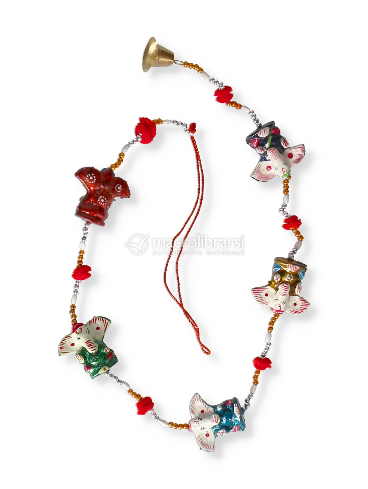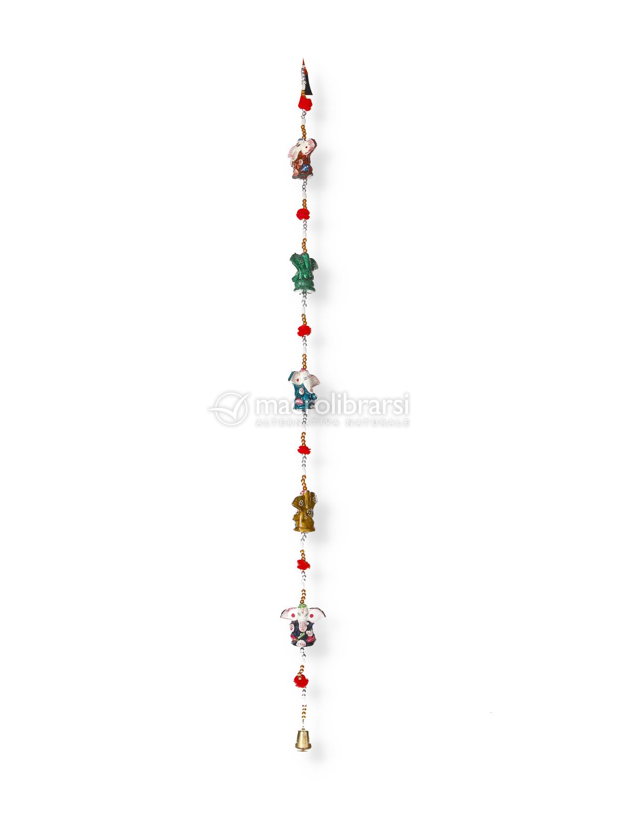 Ghirlanda decorativa con 5 Ganesh colorati in plastica e campanellino finale.