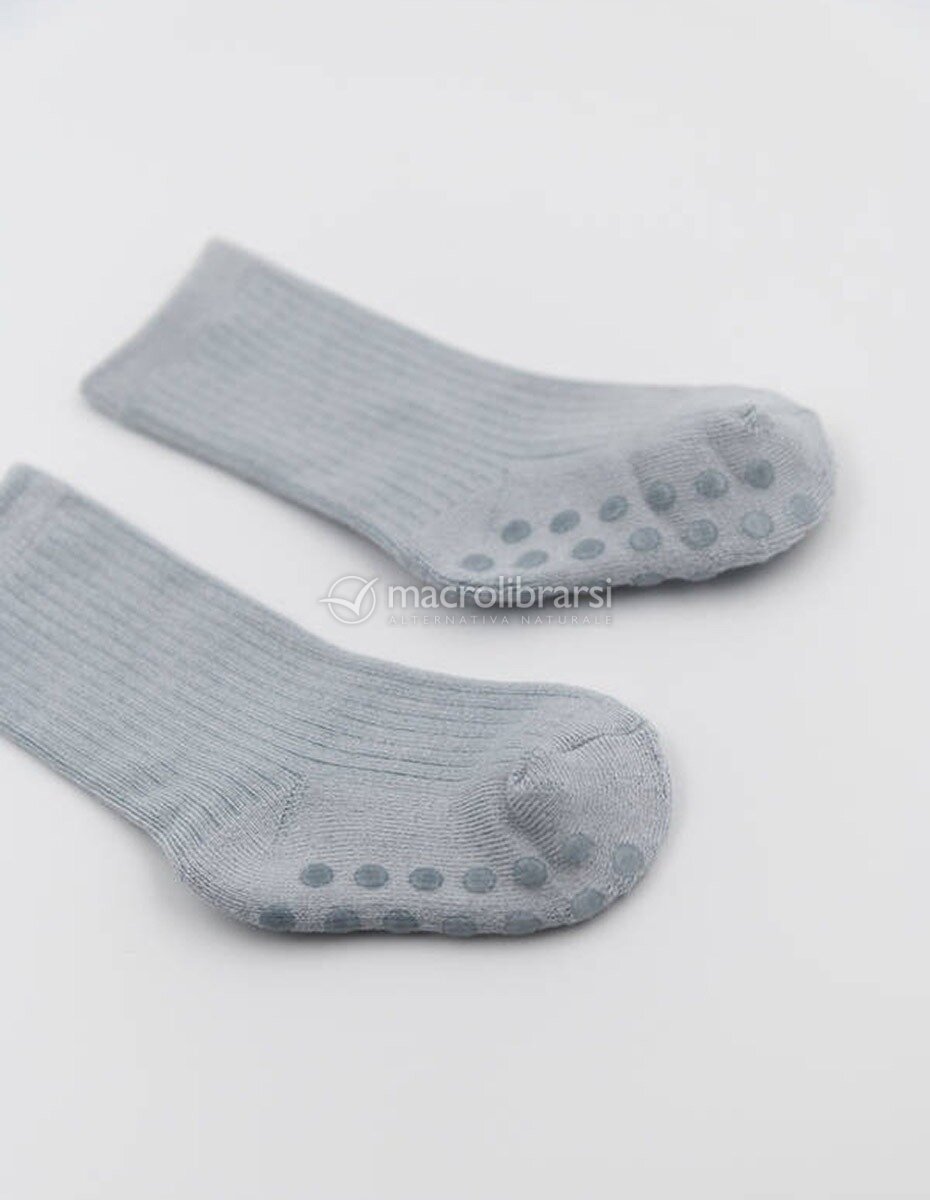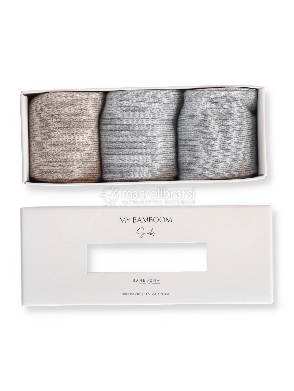 Confezione regalo con 3 paia di calzini antiscivolo in fibra di bambù naturale per bambini dai 2 ai 4 anni, uno color sabbia e due azzurri.