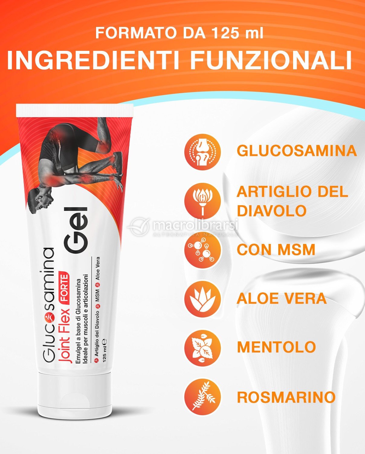Gel a tripla azione per massaggi a muscoli e articolazioni. È formulato con ingredienti vegetali e naturali: Glucosamina, Artiglio del Diavolo, MSM, Aloe vera, Mentolo, Pinus Sylvestris, Citrus Dulcis e Rosmarino.