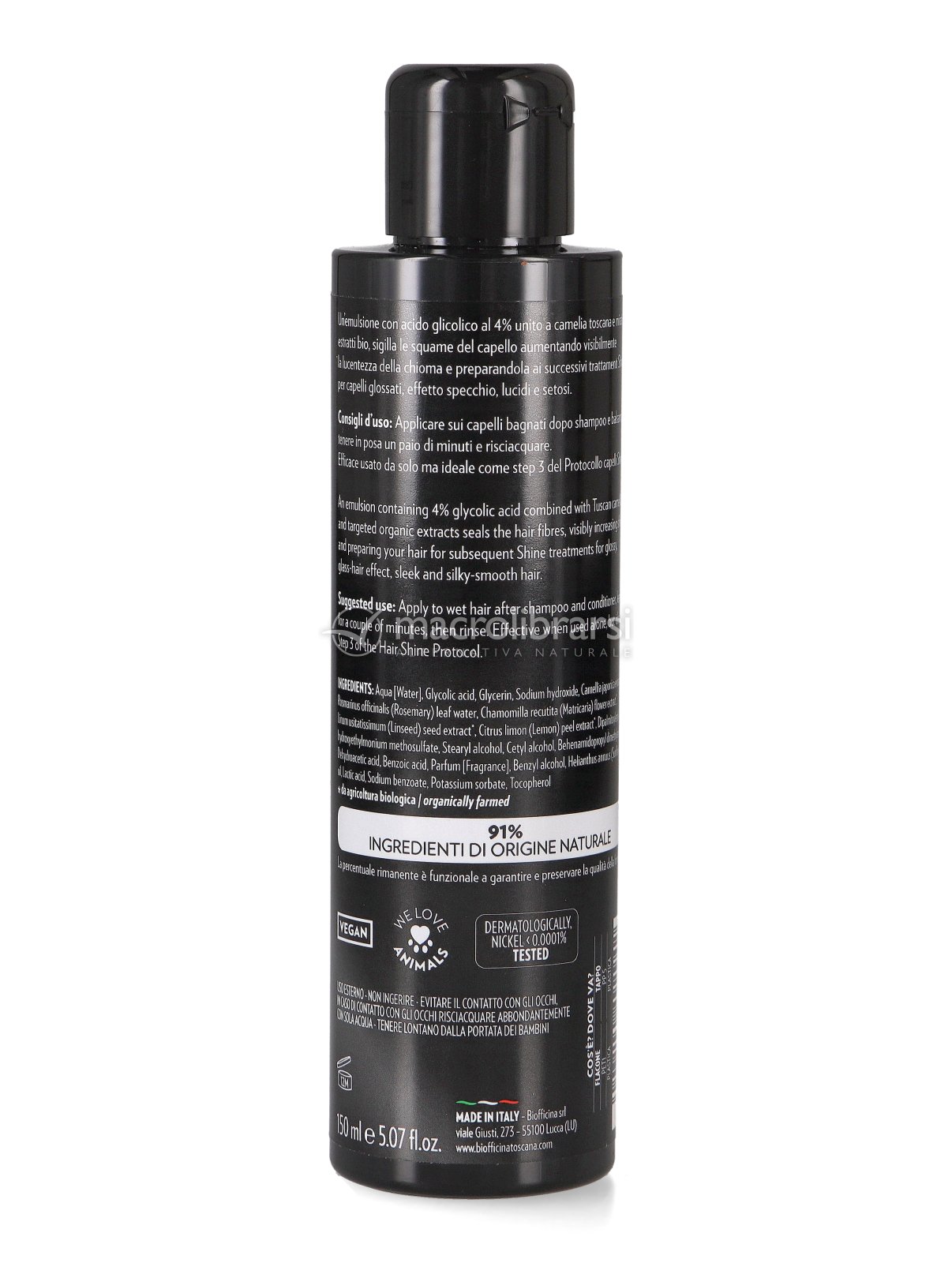 Emulsione con acido glicolico al 4% e camelia toscana, indicata per sigillare le squame del capello aumentando visibilmente la lucentezza della chioma e preparandola ai successivi trattamenti illuminanti Shine.