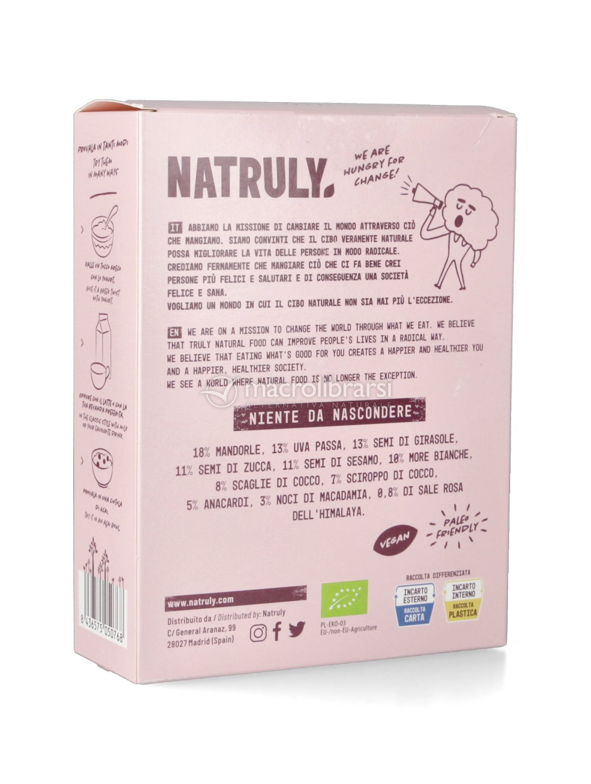 Un prodotto molto buono che non presenta cereali ma semi e frutta ideale per la colazione e merende, molto consigliato a chi ama questi tipi di mix o anche per chi vuole sperimentare questi super food semplici e nutrienti. Qui presenti more e uvetta che rendono dolce il preparato.