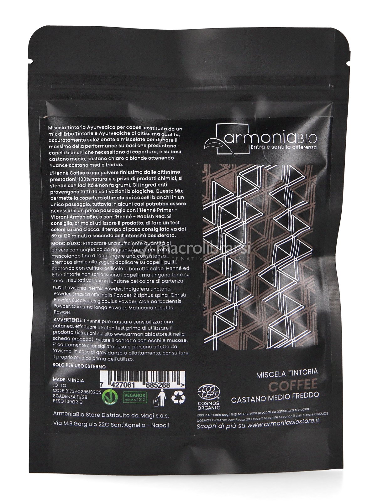 La tinta vegetale ayurvedica Coffee di ArmoniaBio colora tono su tono con un castano medio freddo senza riflessi rossi, rinforzando i capelli e rendendoli più lucidi e voluminosi.