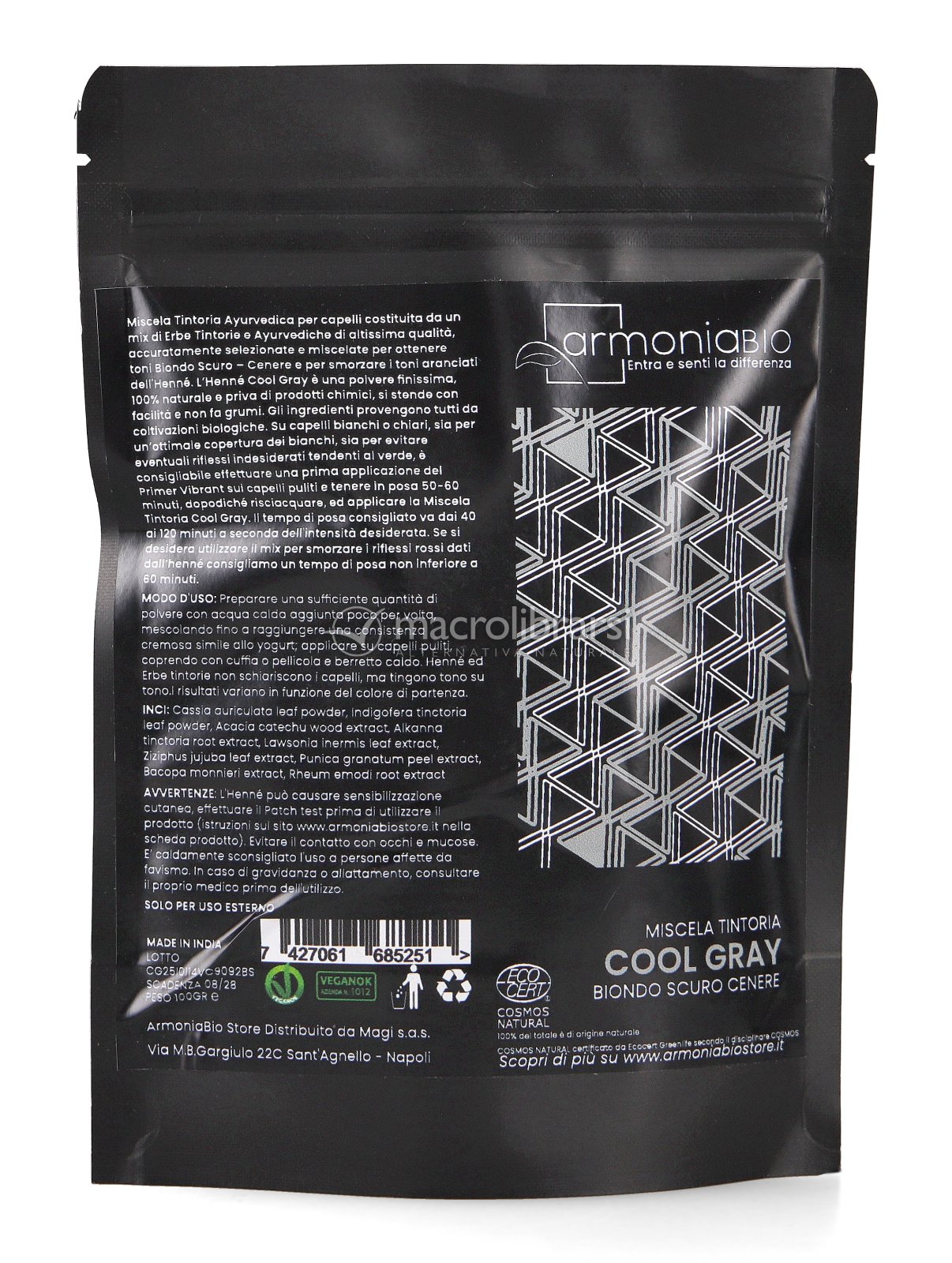 La tinta vegetale ayurvedica Cool Gray di ArmoniaBio colora tono su tono con un biondo scuro cenere e spegne i toni aranciati dell'hennè.