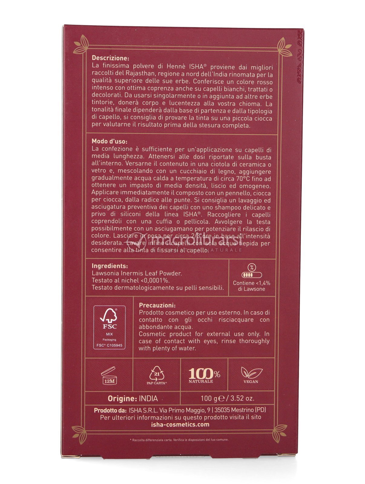 Henné del Rajasthan è una tintura per capelli 100% naturale e vegetale, ottenuta da Lawsonia Inermis di alta qualità.