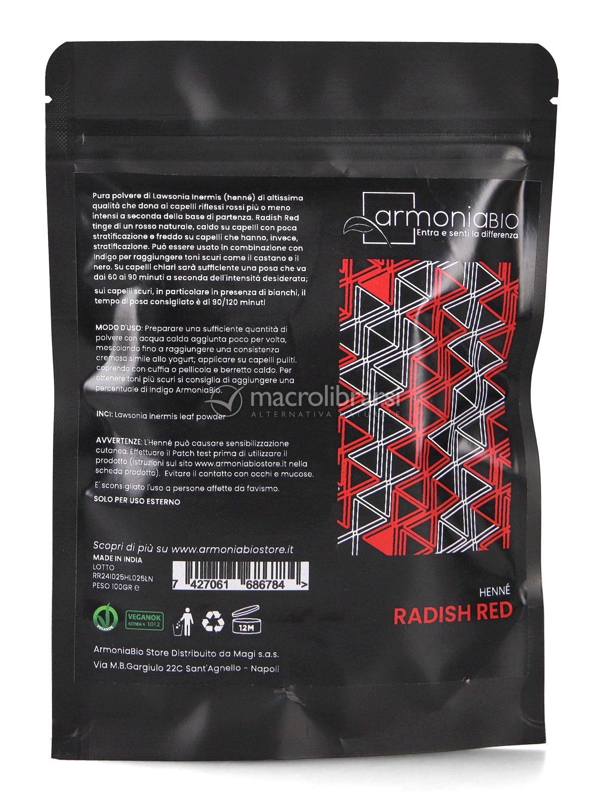 L'henné rosso Radish Red ArmoniaBio colora i capelli in modo naturale rinforzandoli e rendendoli più lucidi e disciplinati, donando un colore: