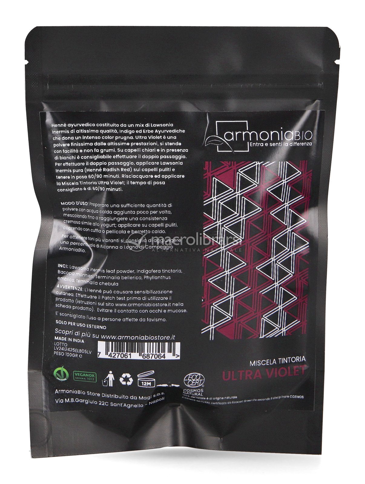 La tinta vegetale ayurvedica Ultra Violet di ArmoniaBio colora tono su tono con un castano prugna intenso, ricco di riflessi, rinforzando i capelli e rendendoli più lucidi e voluminosi.