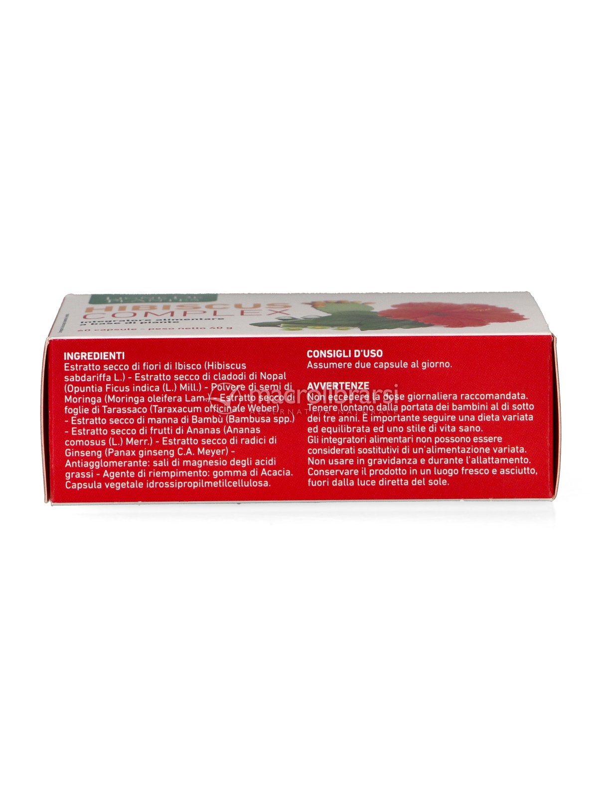 Estratto secco di fiori di Ibisco (Hibiscus sabdariffa L.) - Estratto secco di Cladodi di Nopal (Opuntia Ficus indica (L.) Mill.) - Polvere di semi di Moringa (Moringa oleifera Lam.) - Estratto secco di foglie di Tarassaco (Taraxacum officinale Weber) - Estratto secco di manna di Bambù (Bambusa spp.) - Estratto secco di frutti di Ananas (Ananas comosus (L.) Merr.) - Estratto secco di radici di Ginseng (Panax ginseng C.A. Meyer) - Antiagglomerante: sali di magnesio degli acidi grassi - Agente di riempimento: gomma di Acacia. Capsula vegetate Idrossipropilmetilcellulosa.