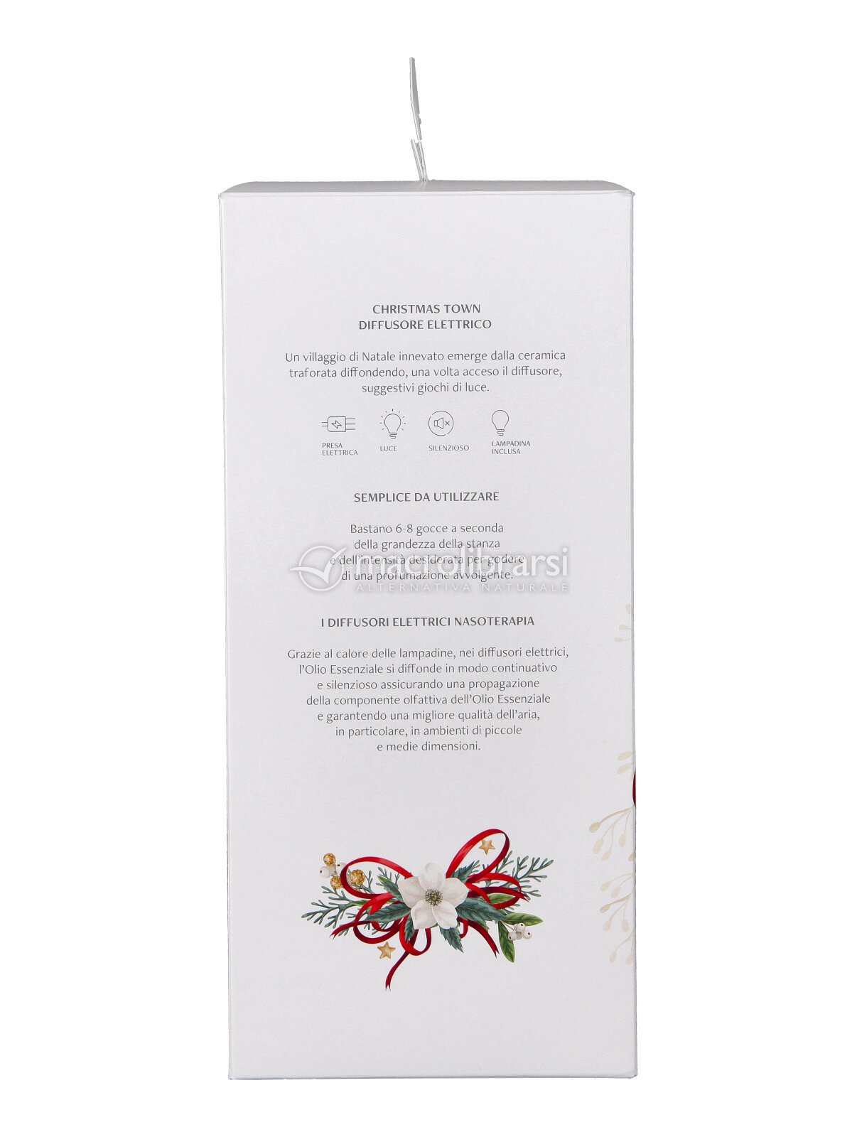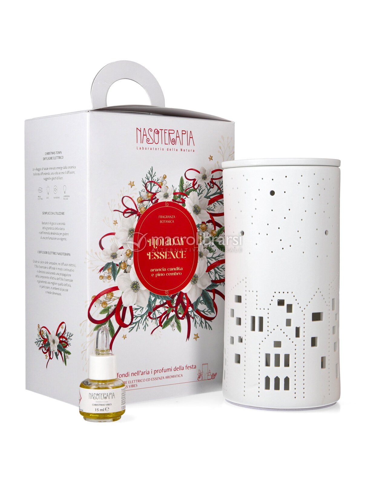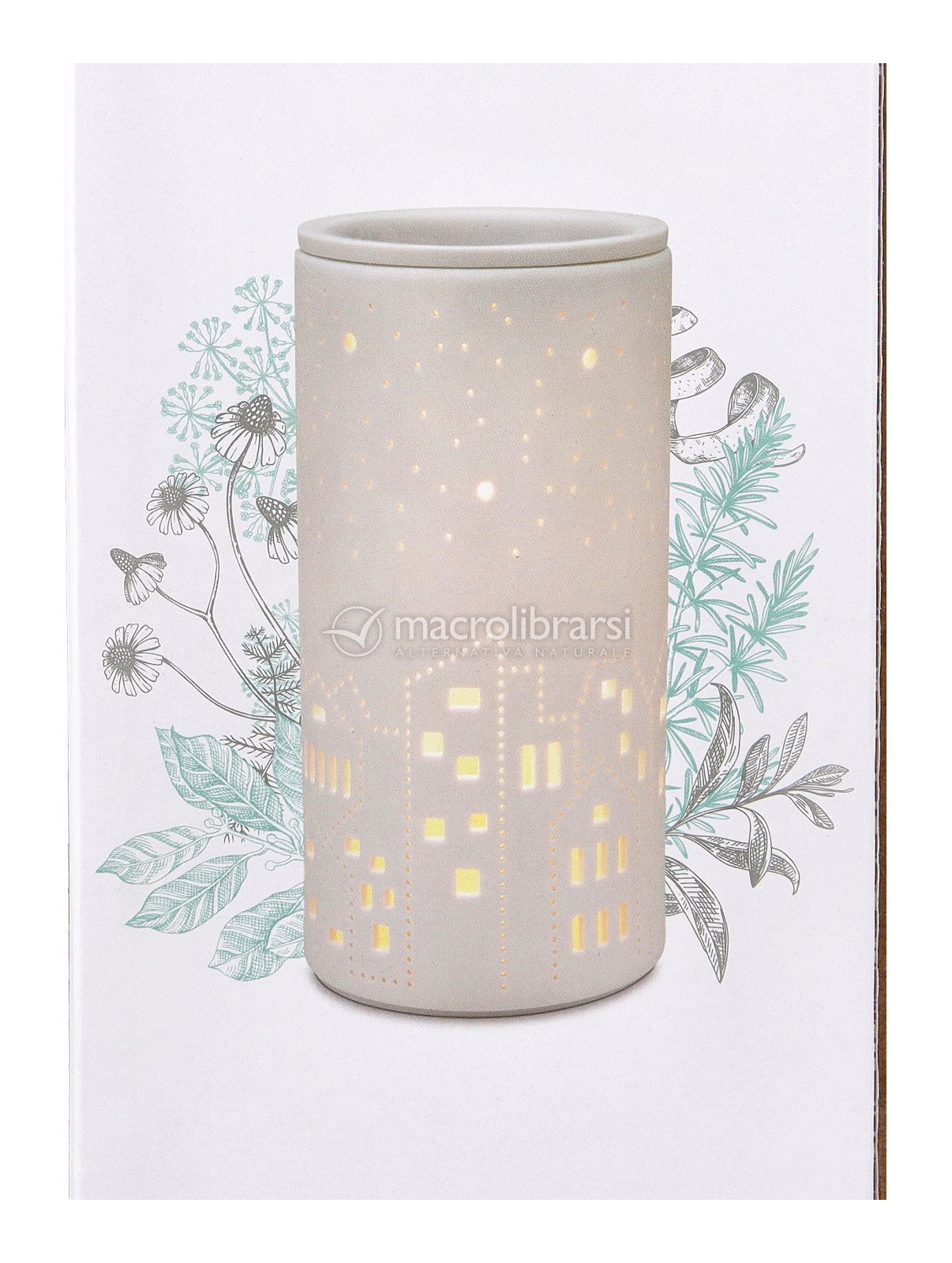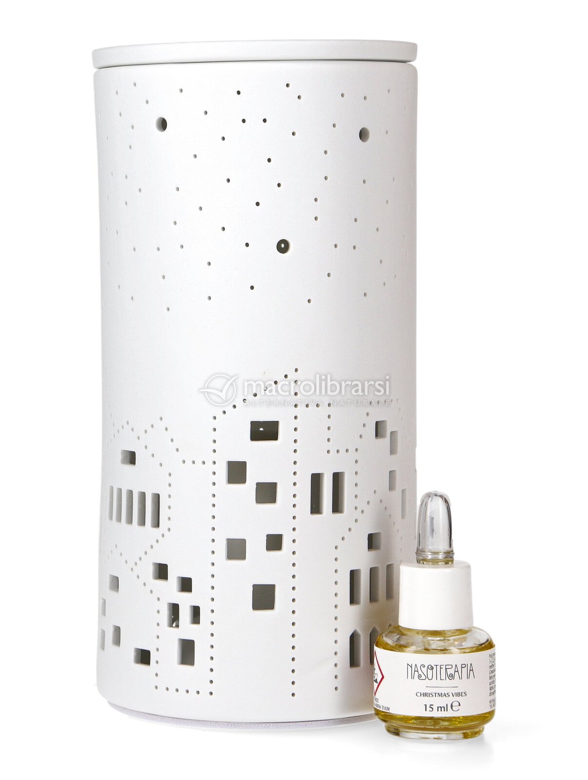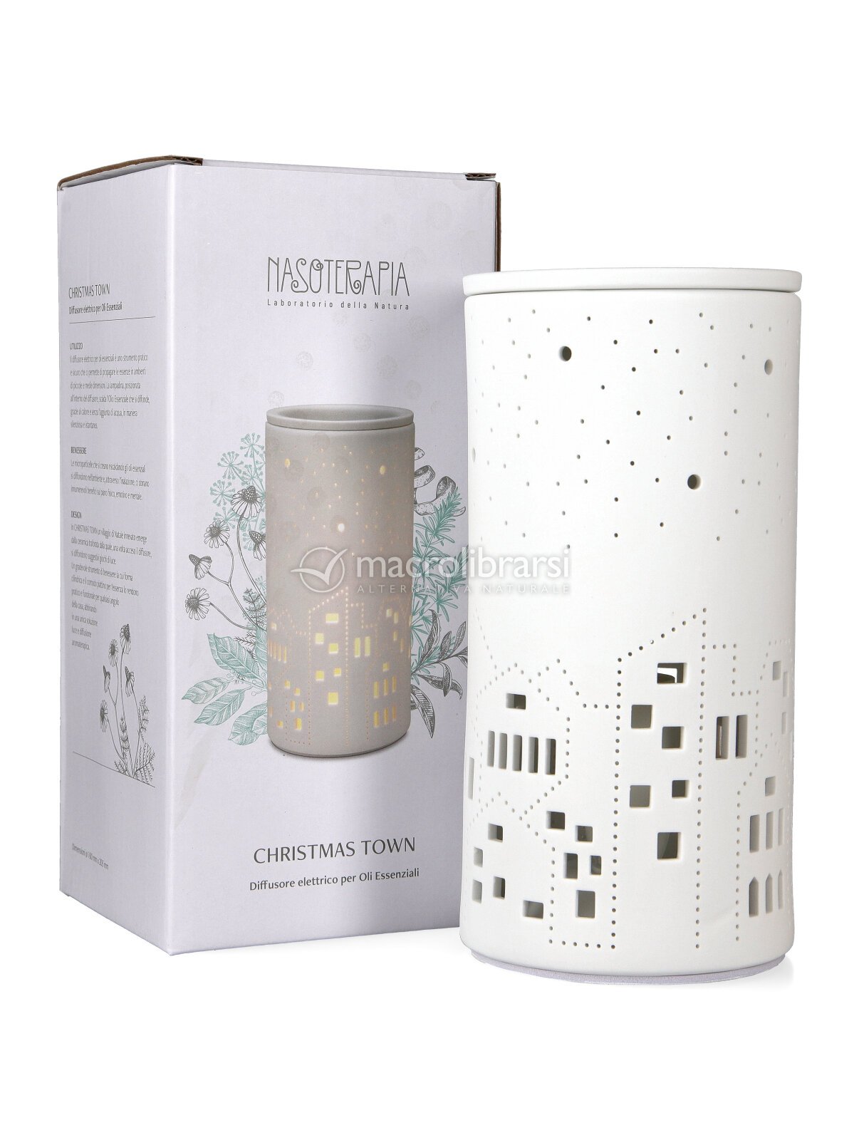 Un villaggio di Natale innevato emerge dalla ceramica traforata diffondendo, una volta acceso il diffusore, suggestivi giochi di luce.
