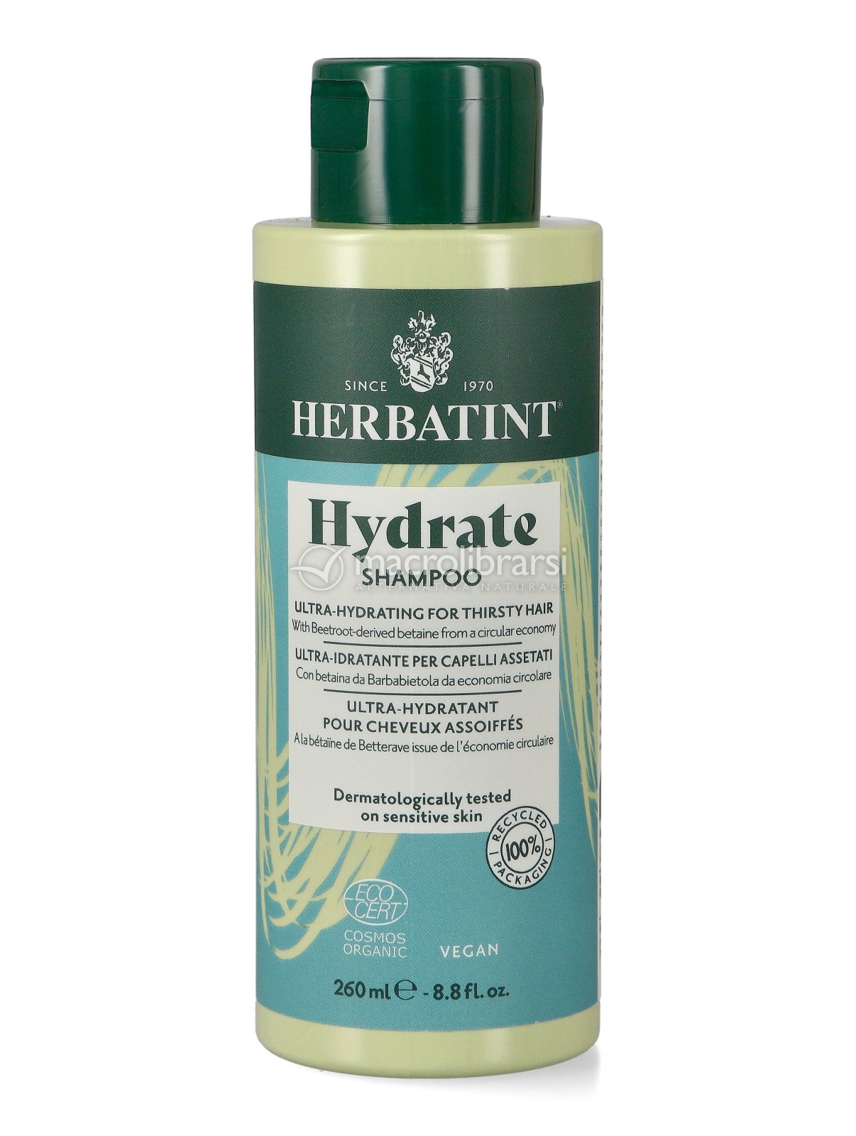 La formula certificata biologica di Hydrate Shampoo contiene un'elevata concentrazione di estratto di Maca peruviana, che rinforza e dona nuova vitalità alla chioma, unita ad un complesso osmoprotettore derivato dalla barbabietola che mantiene in equilibrio l'idratazione del capello e lo protegge attivamente dallo stress di styling, frizioni e fattori atmosferici.