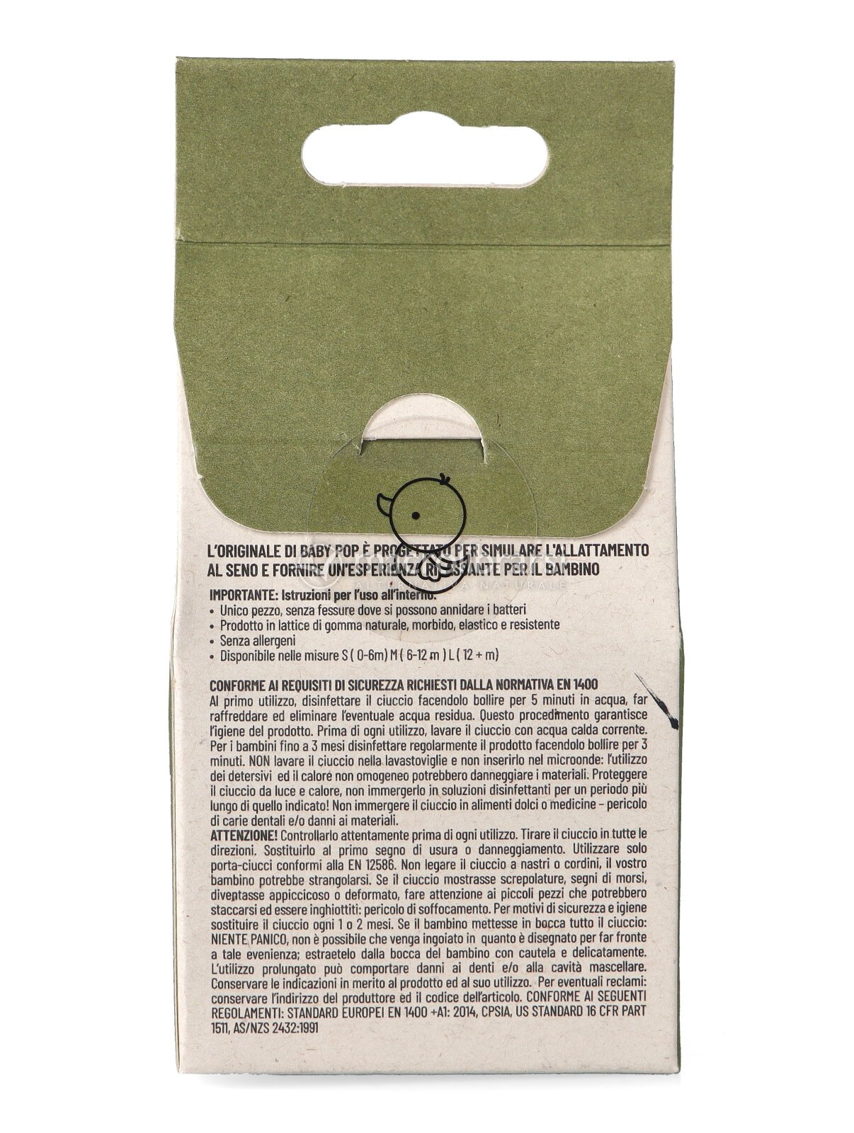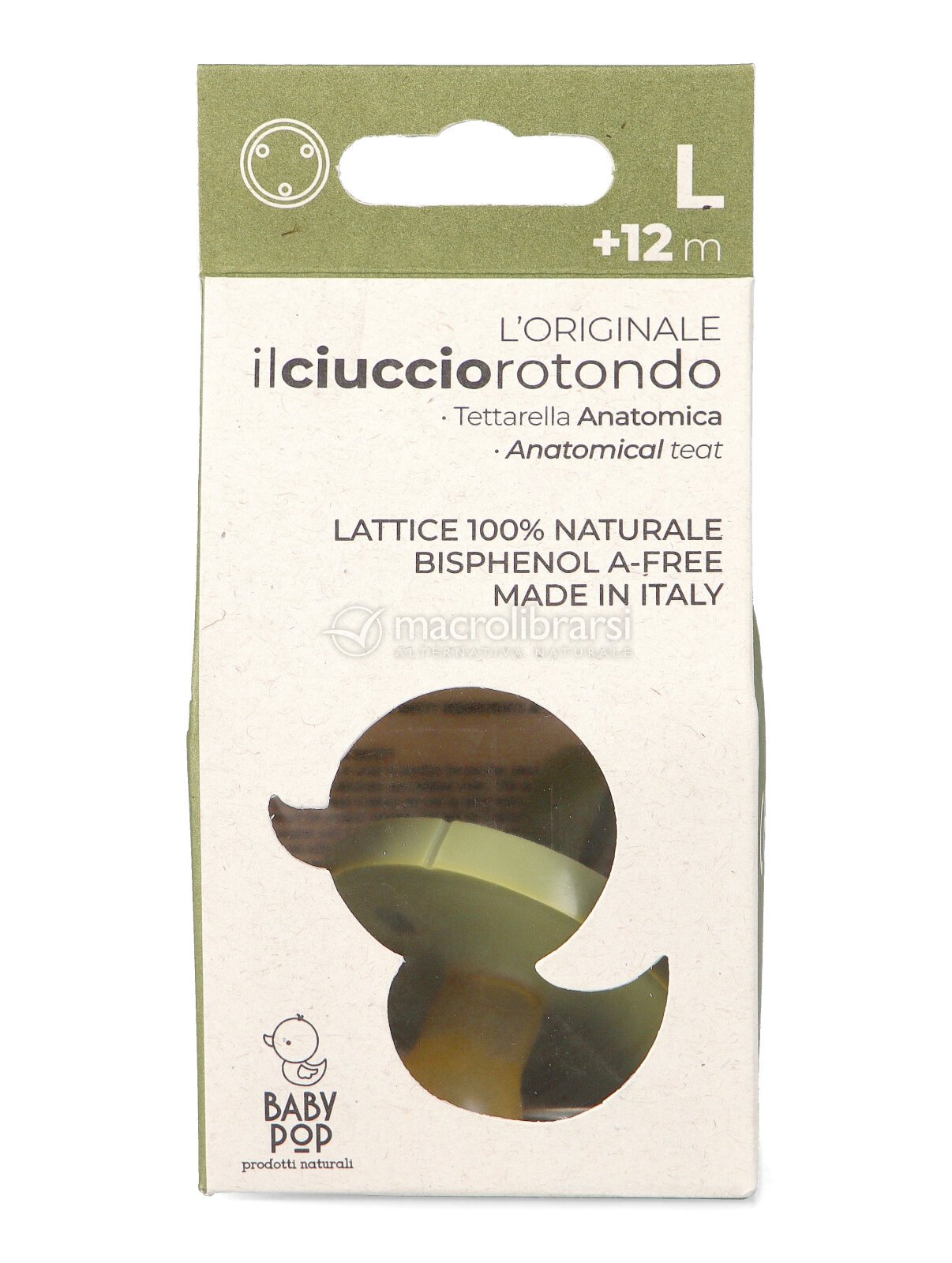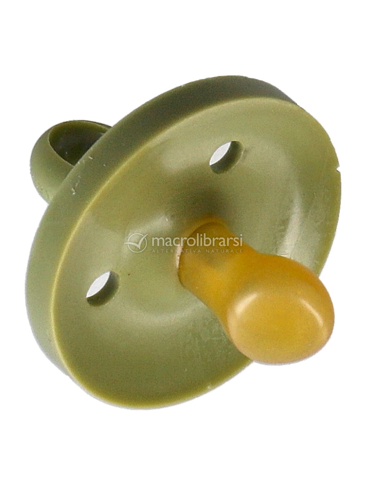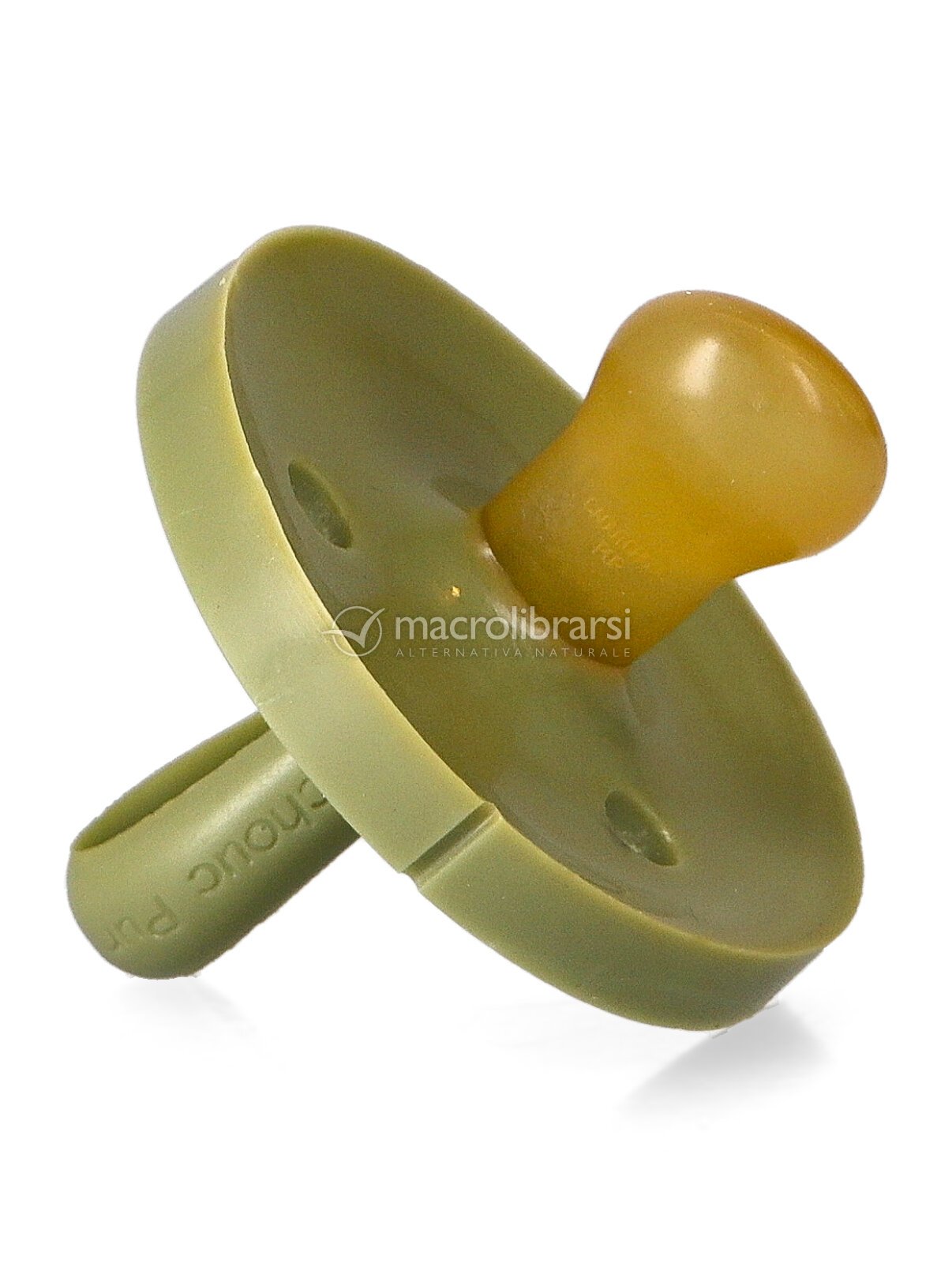 Ciuccio in puro caucciù naturale prodotto in Italia senza BPA, PVC, coloranti artificiali e altre sostanze tossiche.