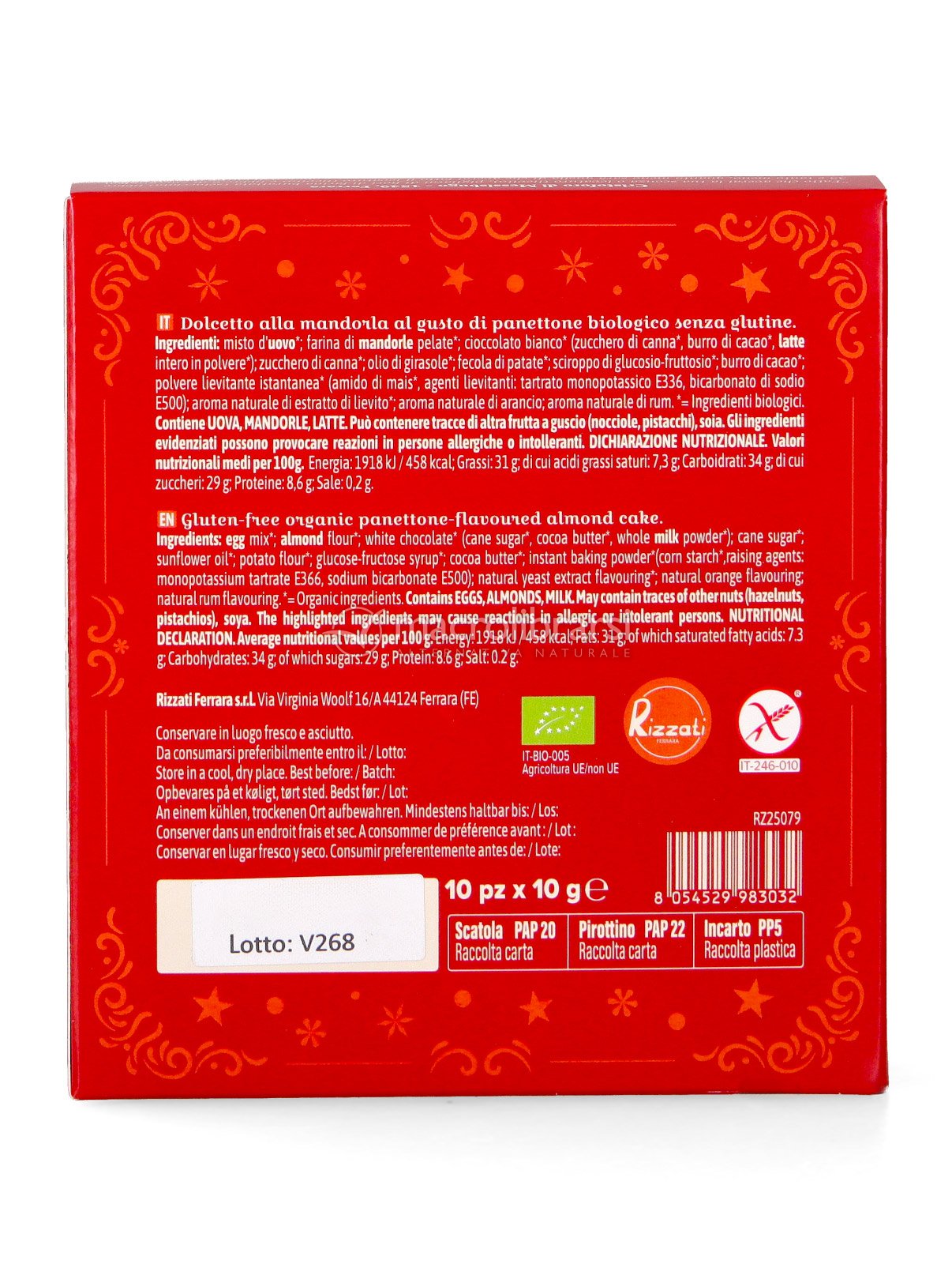 Il Panettoncino Rizzati è un dolcetto alla mandorla al gusto Panettone, biologico e senza glutine: la magia delle feste in un formato tascabile, con incarto plastic-free.
