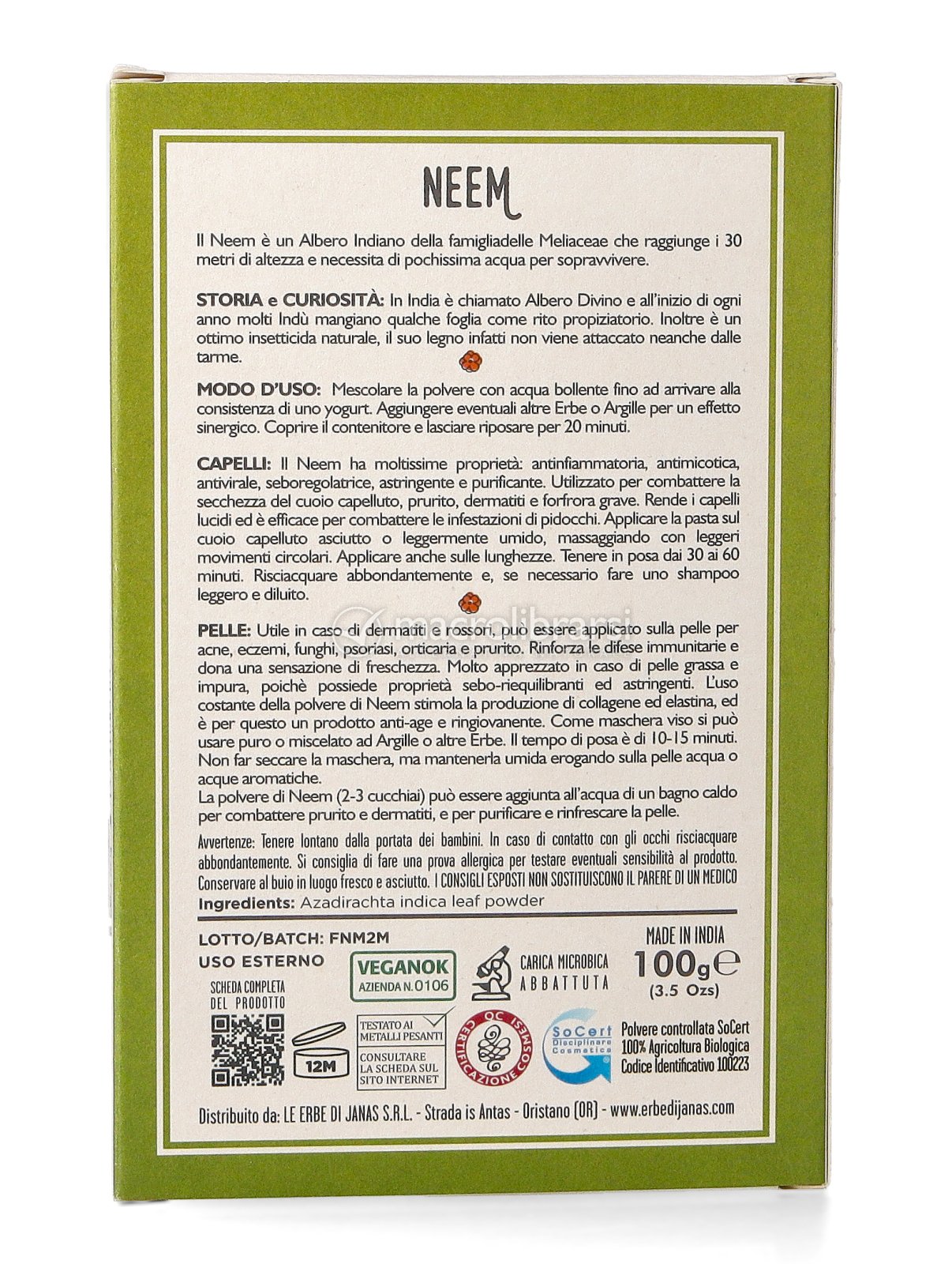 Le Erbe di Janas sono una garanzia. Ottimo prodotto. La polvere di Neem è molto apprezzata per le sue proprietà purificanti, astringenti e antisettiche. La mia ragazza la utilizza per impacchi e maschere ai capelli e al viso, sia da sola che mischiata ad argilla e altre polveri (come ad esempio Kapoor Kachli e Amla)