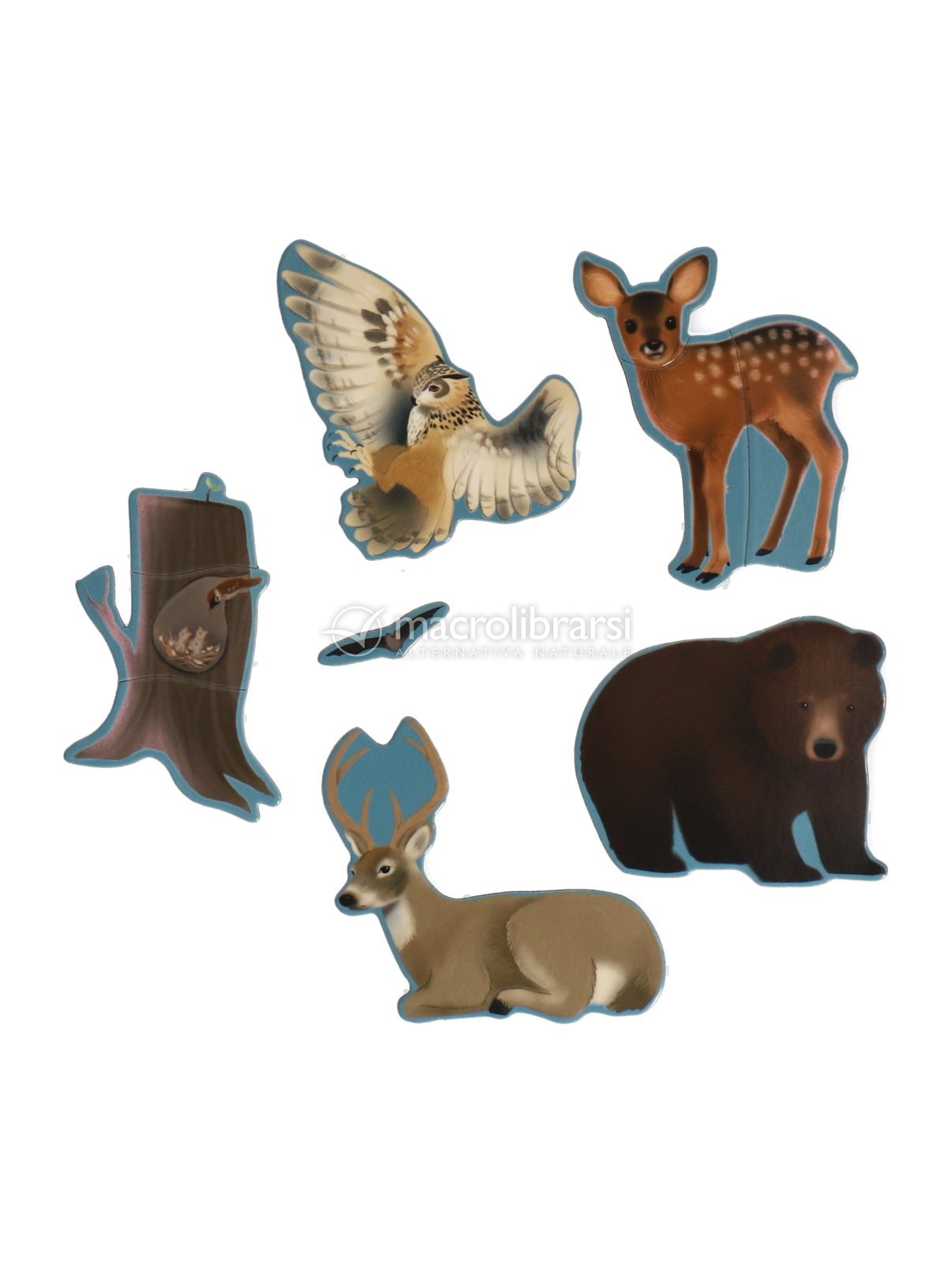 Un cofanetto interattivo con più di 60 magneti e un tabellone magnetico per scoprire gli animali della foresta di notte.