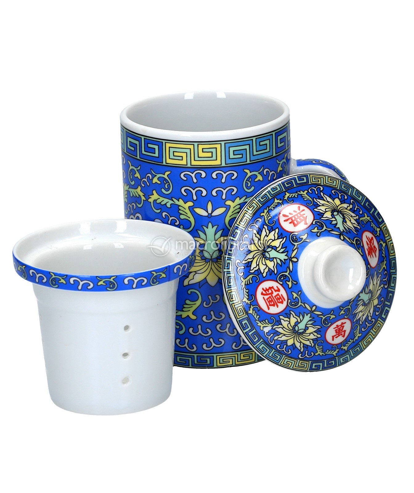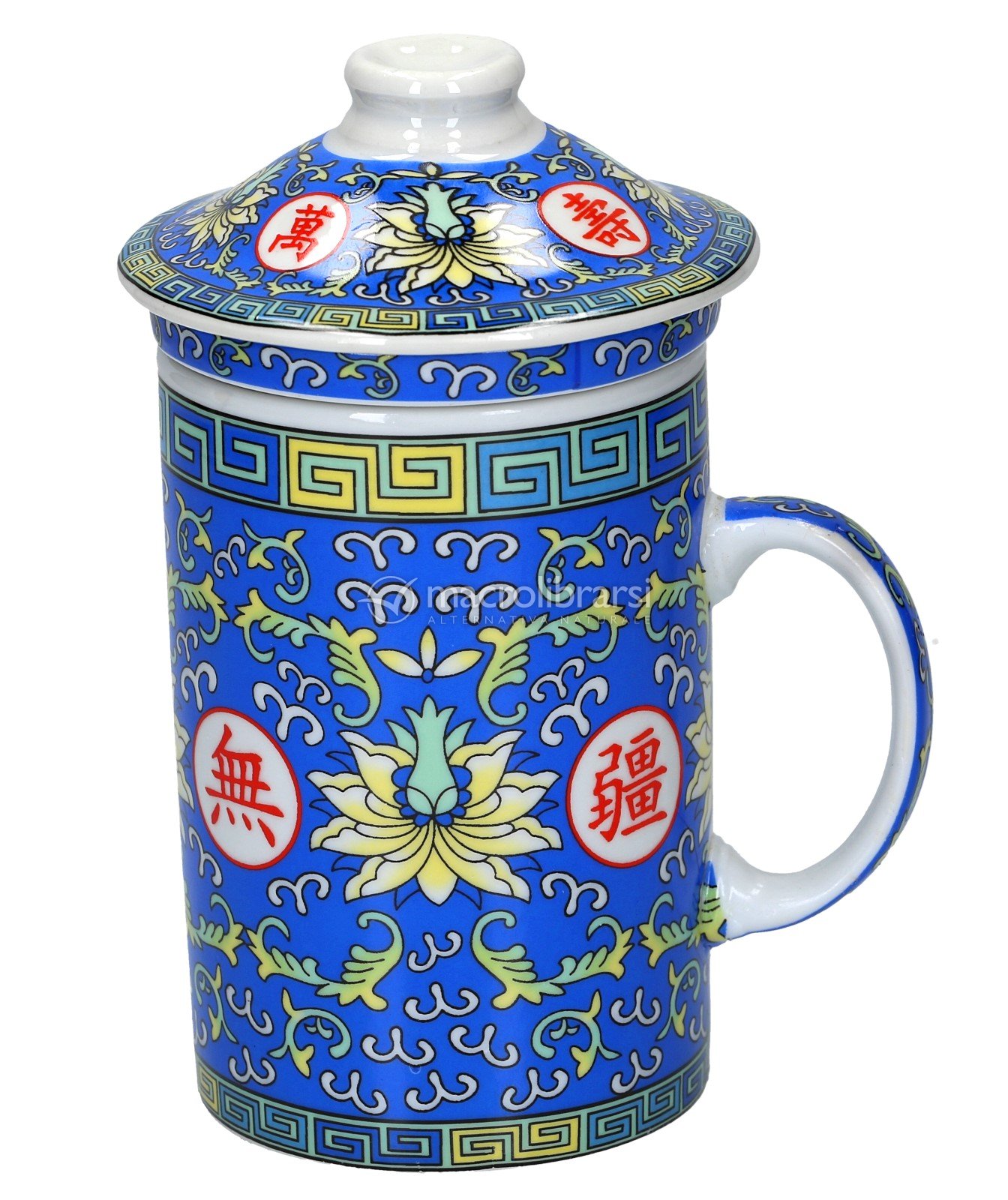 Tazza da tè decorata a mano come le antiche porcellane cinesi, completa di filtro in porcellana e coperchio.