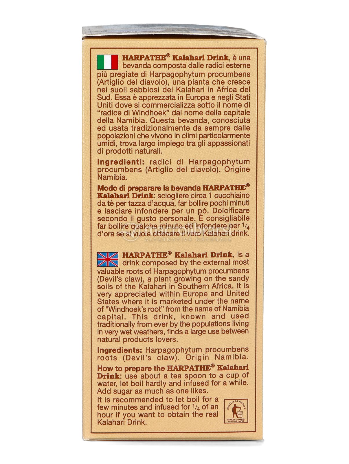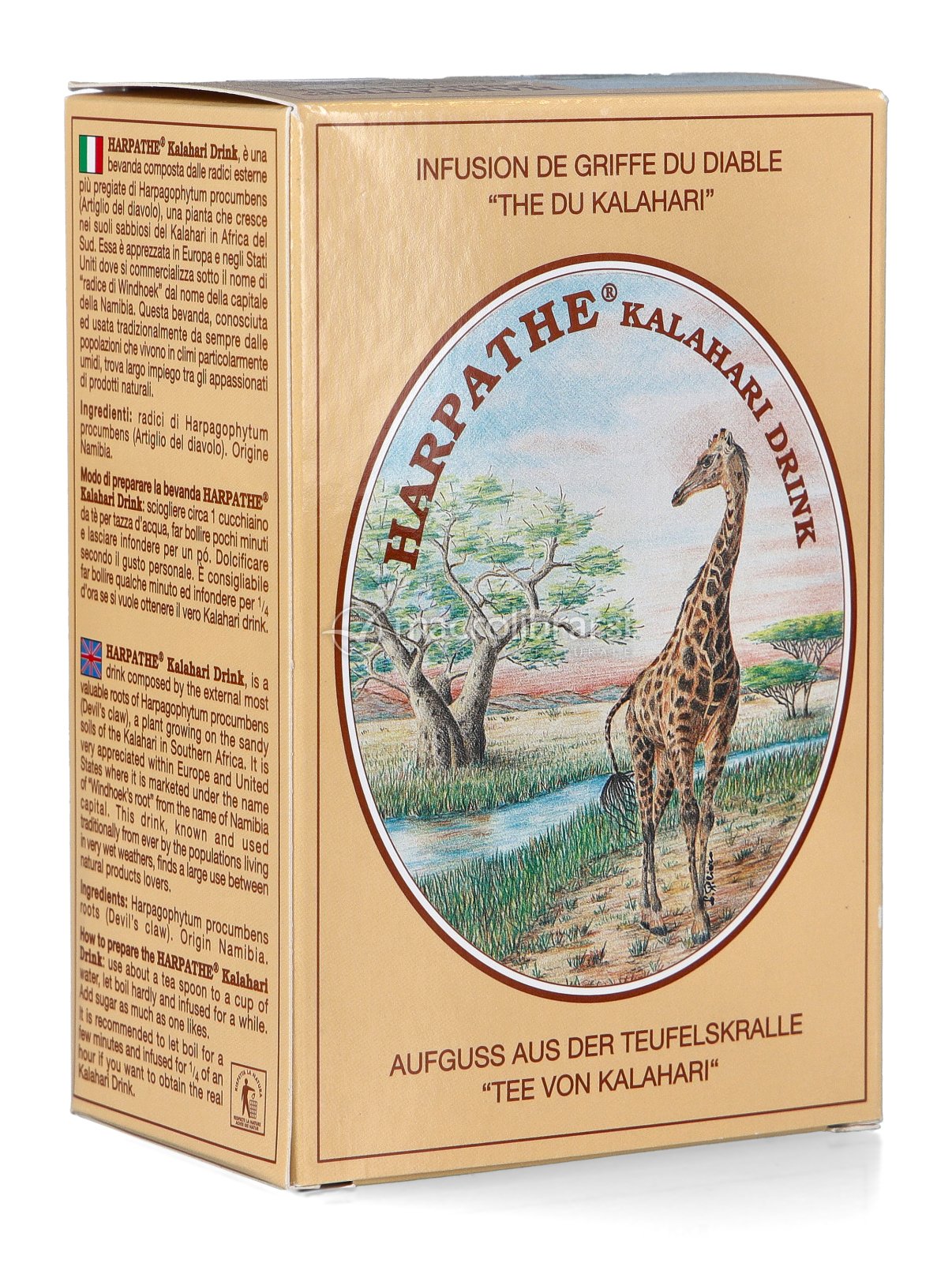 Bevanda a base delle radici esterne più pregiate di Harpagophytum procumbens (Devil’s Claw, Artiglio del Diavolo), pianta che cresce nei suoli sabbiosi del Kalahari, in Africa del Sud.