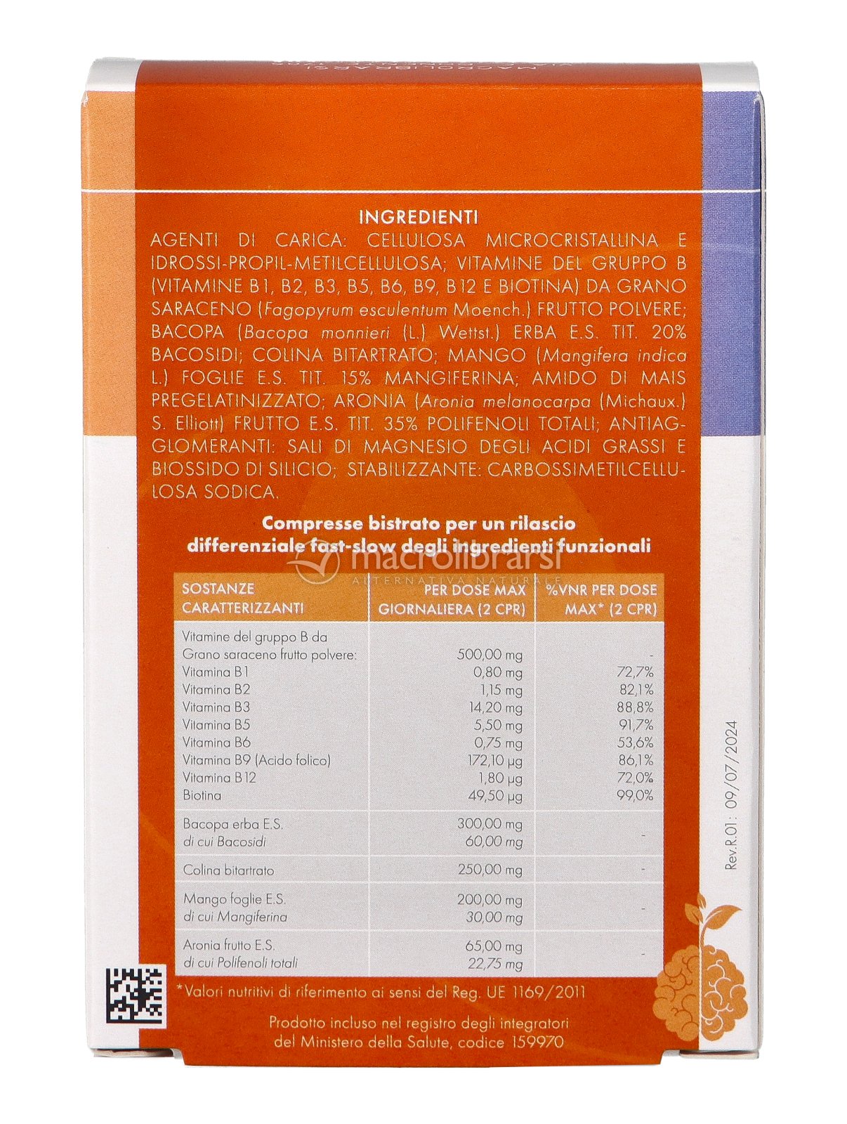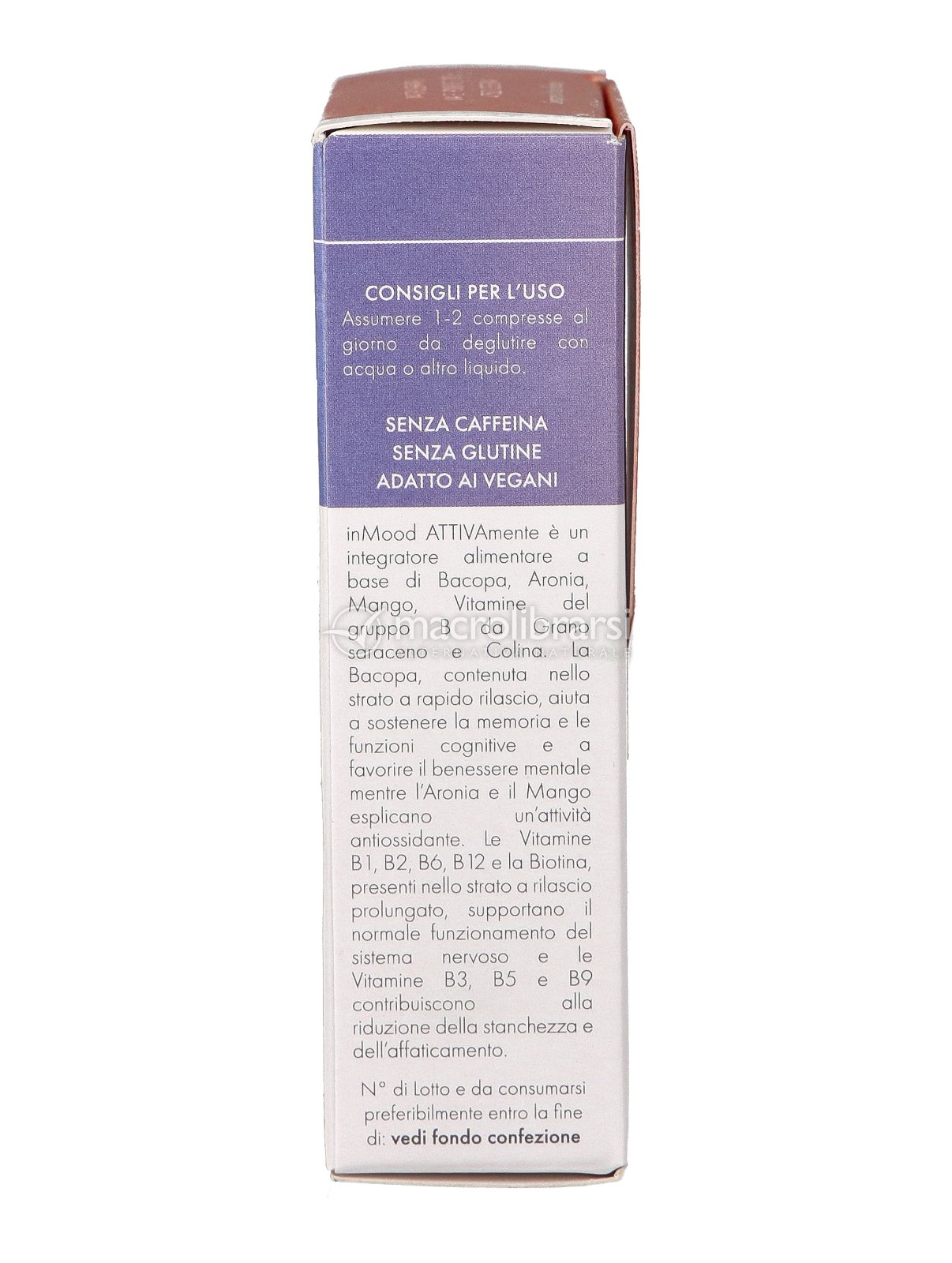 inMood ATTIVAmente è un integratore in compresse bistrato a rilascio controllato a base di Aronia, Mango, Vitamine del gruppo B da grano saraceno per supportare il normale funzionamento del sistema nervoso (B1, B2, B6, B12), in sinergia con Colina e Bacopa, per sostenere la memoria e supportare le funzioni cognitive.