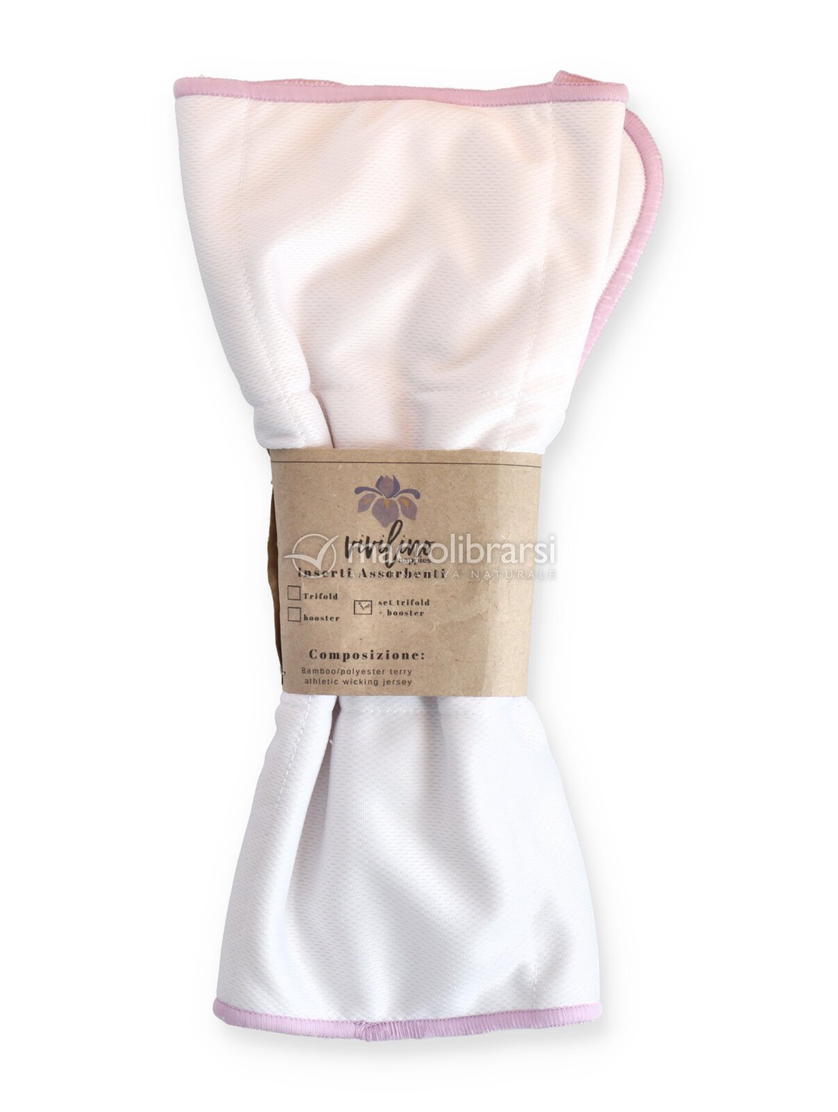 Entrambi gli inserti (un trifold ripiegabile e un ulteriore booster) hanno uno strato in morbidissima spugna di bambù e uno strato in tessuto tecnico AWJ, ultra traspirante, così puoi scegliere quale materiale tenere a contatto con la pelle del bambino.