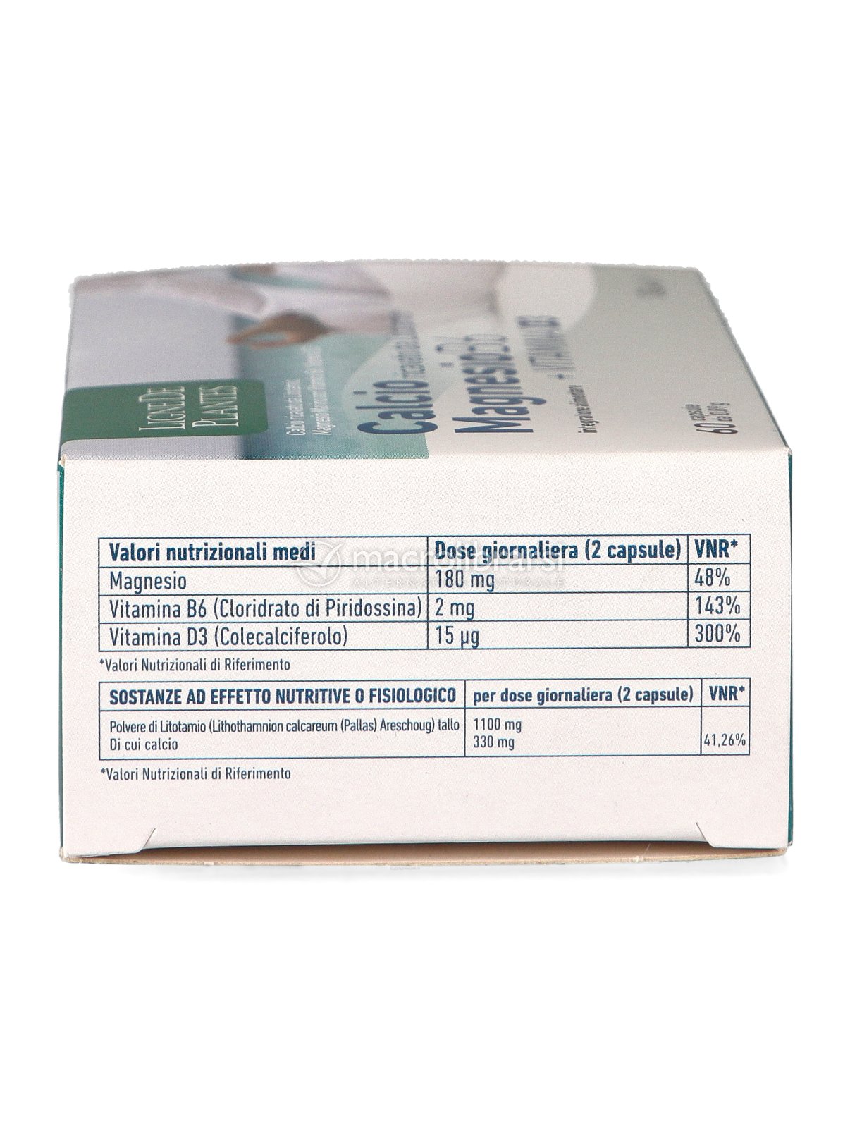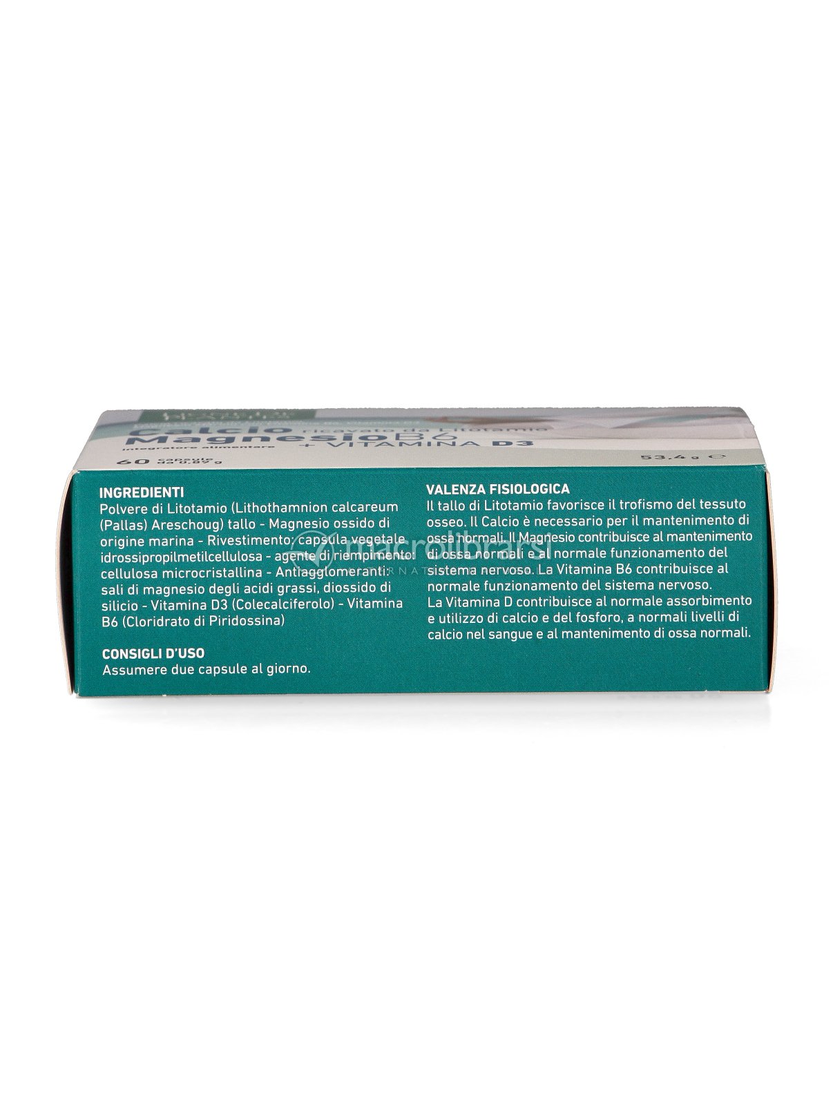 Polvere di Litotamio (Lithothamnion calcareum (Pallas) Areschoug) tallo - Magnesio ossido di origine marina - Rivestimento: capsula vegetale idrossipropilmetilcellulosa agente di riempimento: cellulosa microcristallina - Antiagglomeranti: sali di magnesio degli acidi grassi, diossido di silicio - Vitamina D3 (Colecalciferolo) - Vitamina B6 (Cloridrato di Piridossina)
