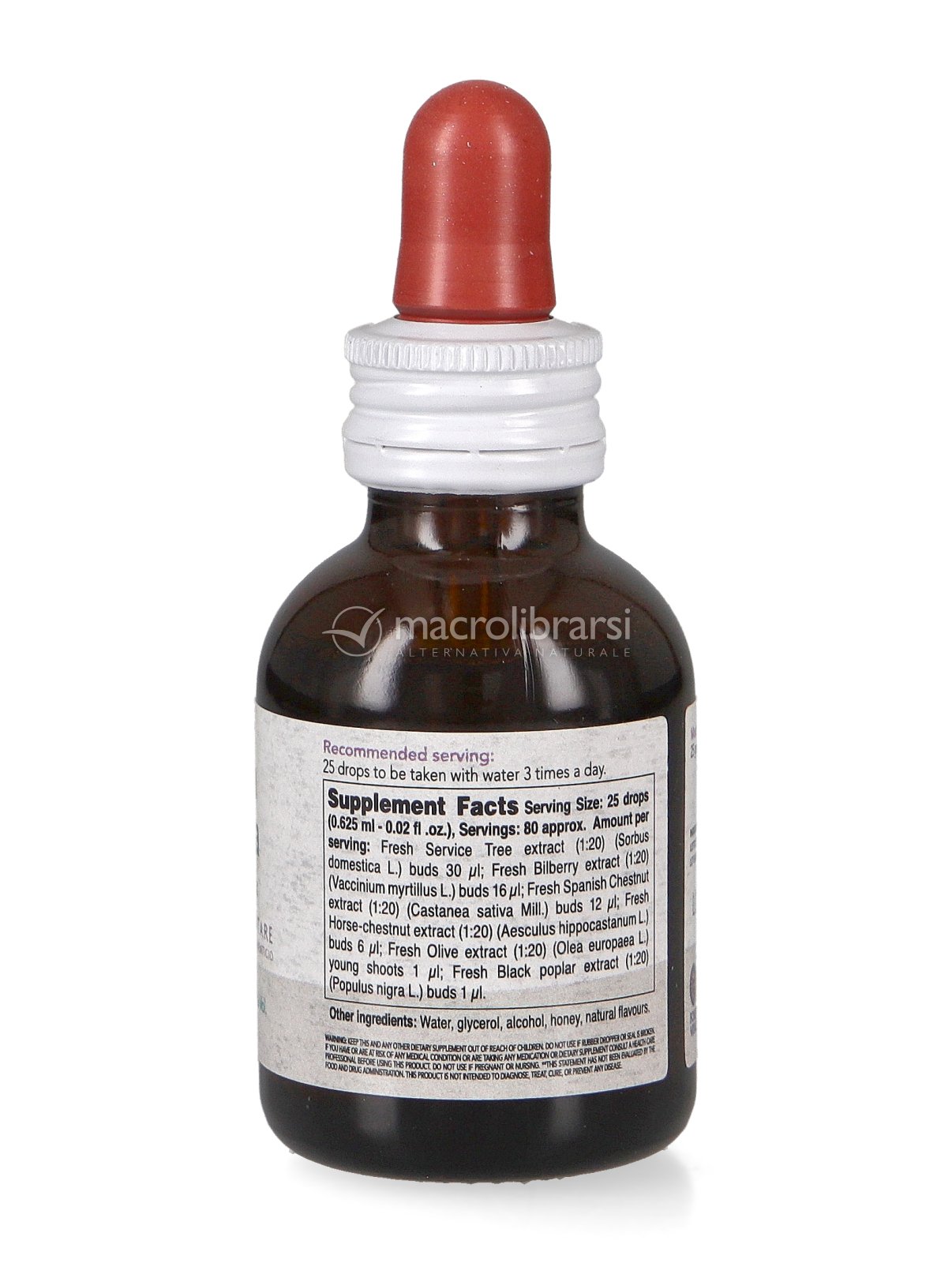 Acqua, glicerolo, alcool, macerati di: Sorbo (Sorbus domestica L.) gemme, Mirtillo nero (Vaccinium myrtillus L.) gemme, Castagno (Castanea vesca Gaertn.) gemme 1.8%, Ippocastano (Aesculus hippocastanum L.) gemme, Olivo (Olea europaea L.) giovani getti, Pioppo nero (Populus nigra L.) gemme, miele, miscela di aromi naturali.