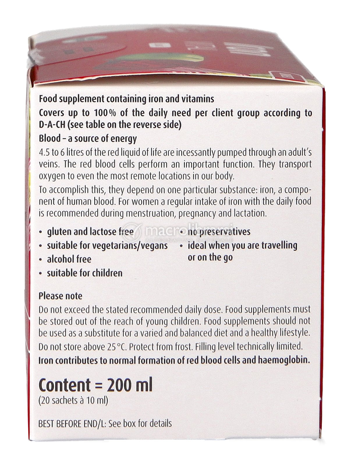 Contiene, inoltre, Vitamina C, che aumenta ulteriormente l'assorbimento del Ferro.
